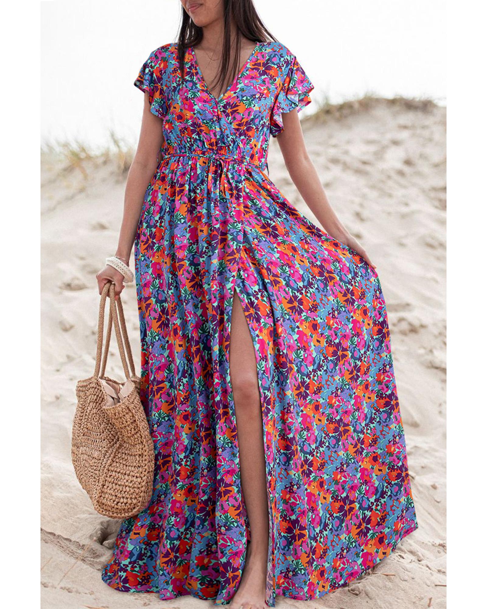 This floral print maxi dress features a stylish V-neck wrap design with a split skirt, combining elegance with comfort. Its high waist silhouette elongates the figure, while the side slit adds a touch of allure and ease of movement. Short sleeves provide coverage and keep you cool, making it suitable for various occasions.