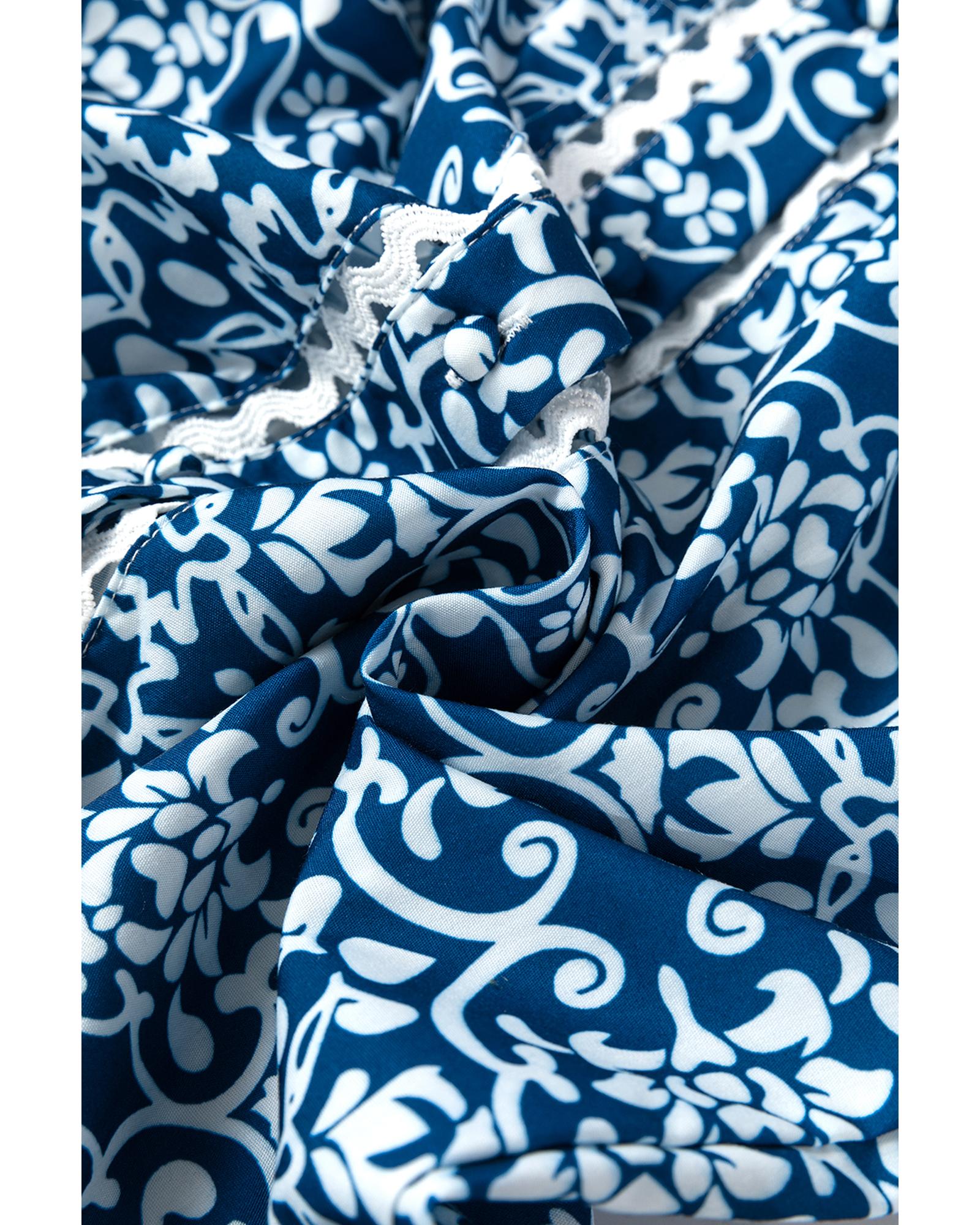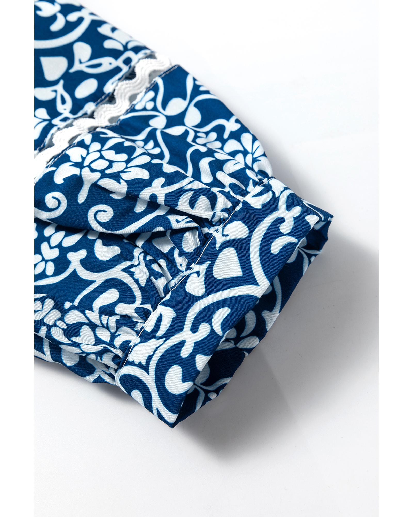 This loose fit shirt features a charming blue floral design with intricate ric rac patchwork details. It offers a versatile style suitable for various occasions and is designed with a trendy fitted look following international sizing standards. For the best fit, it is recommended to select one size larger than your usual size. The shirt is made from 100% polyester and includes long sleeves and a buttoned closure.