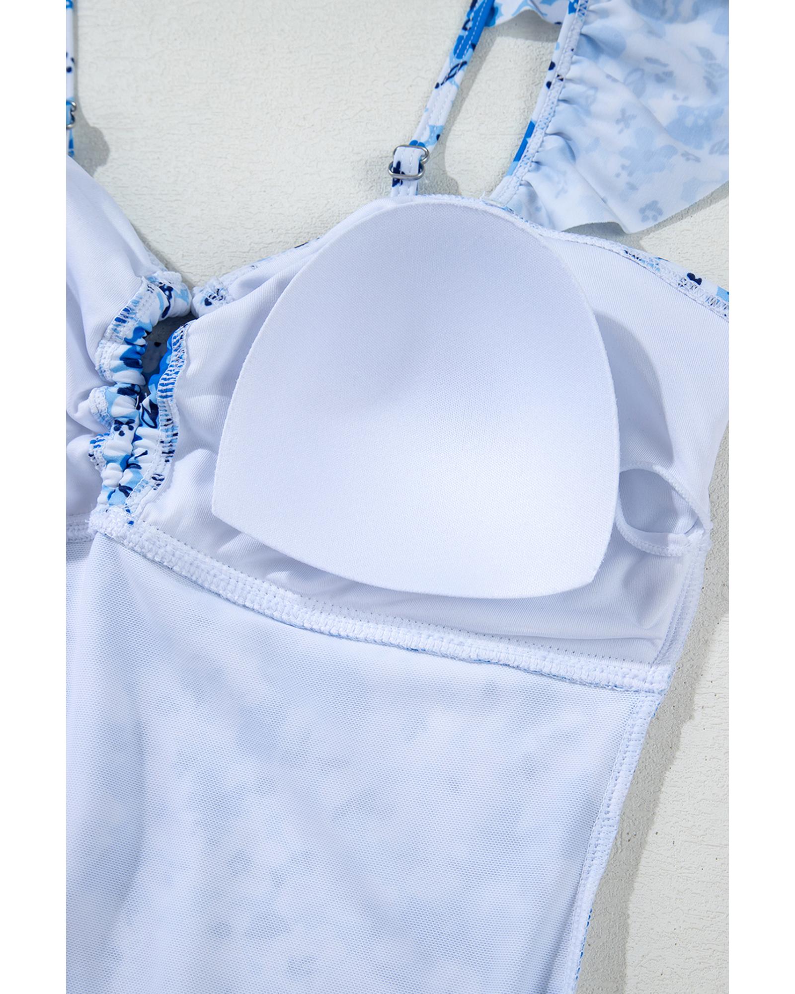 Blue Floral Ruffled Strap Lace-up Hollow Out One Piece Swimsuit – XL