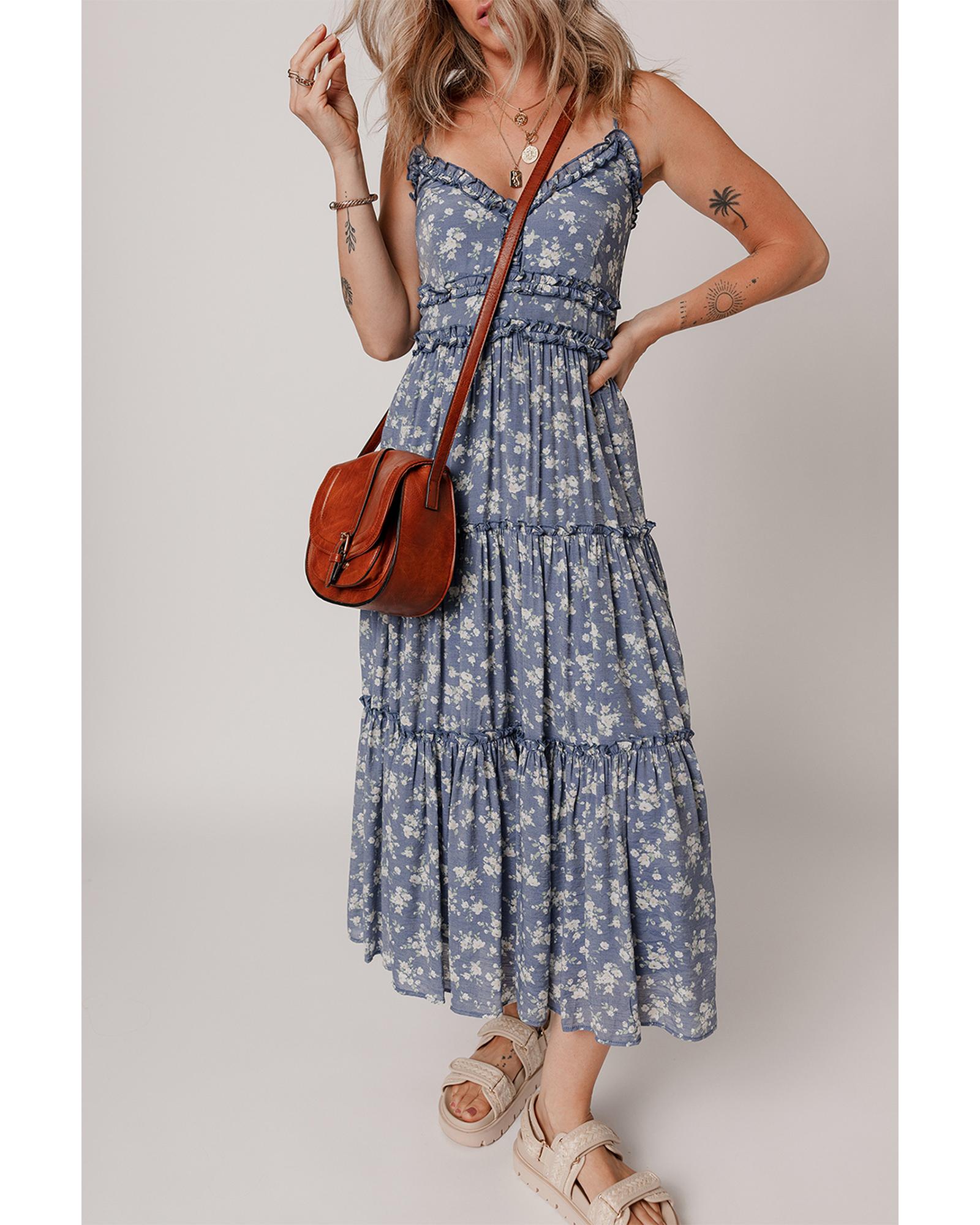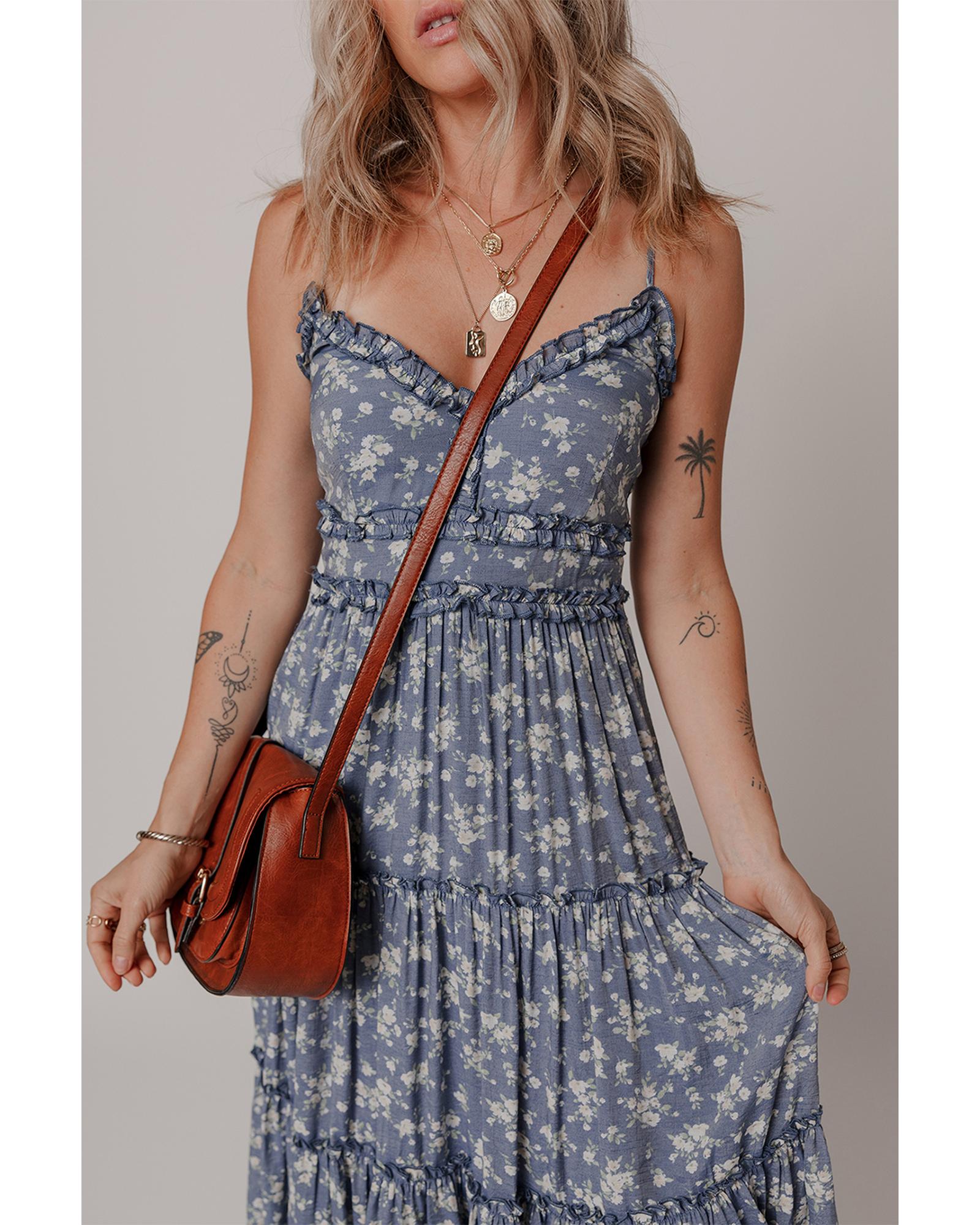 Blue Floral Spaghetti Strap Frilled V Neck Tiered Midi Dress – L