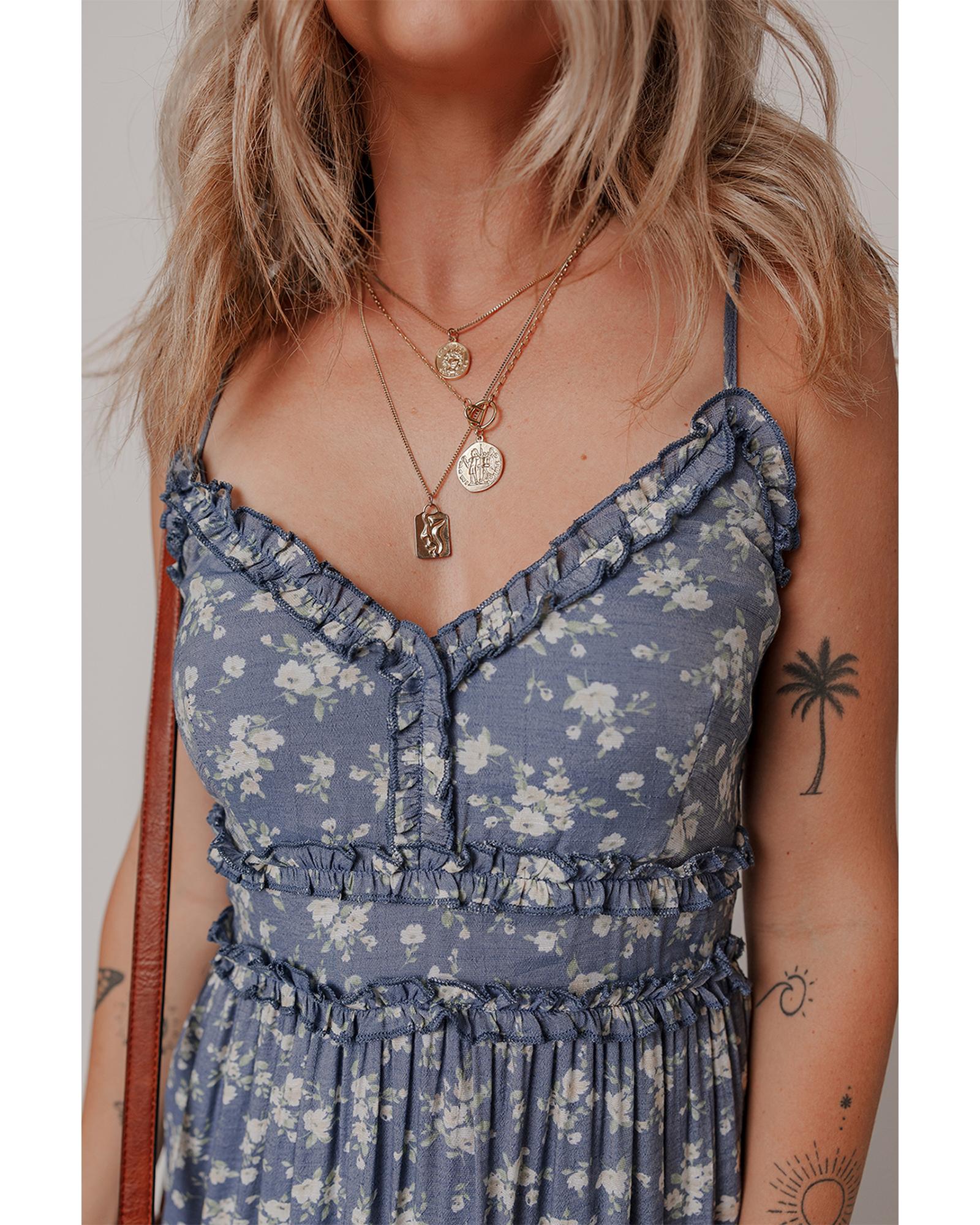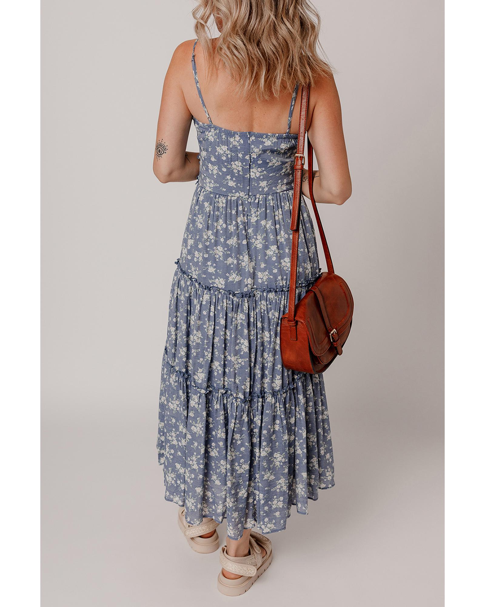 Blue Floral Spaghetti Strap Frilled V Neck Tiered Midi Dress – M