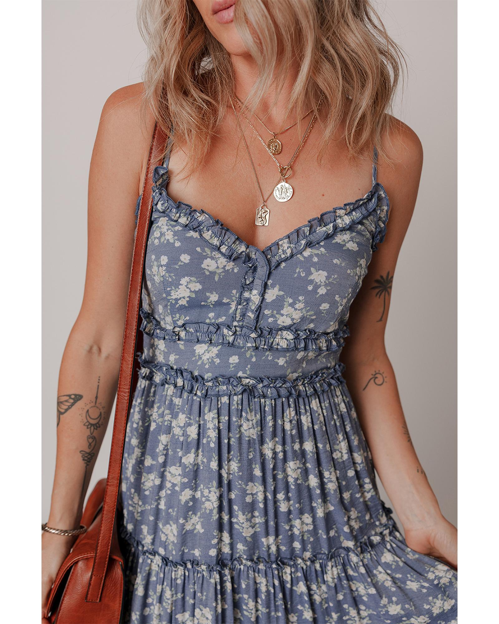 This midi dress features a delicate floral print and a stylish V-neck design, perfect for a chic and feminine look. The dress is designed with spaghetti straps and tiered frilled trims to create a flattering silhouette, making it suitable for various occasions.