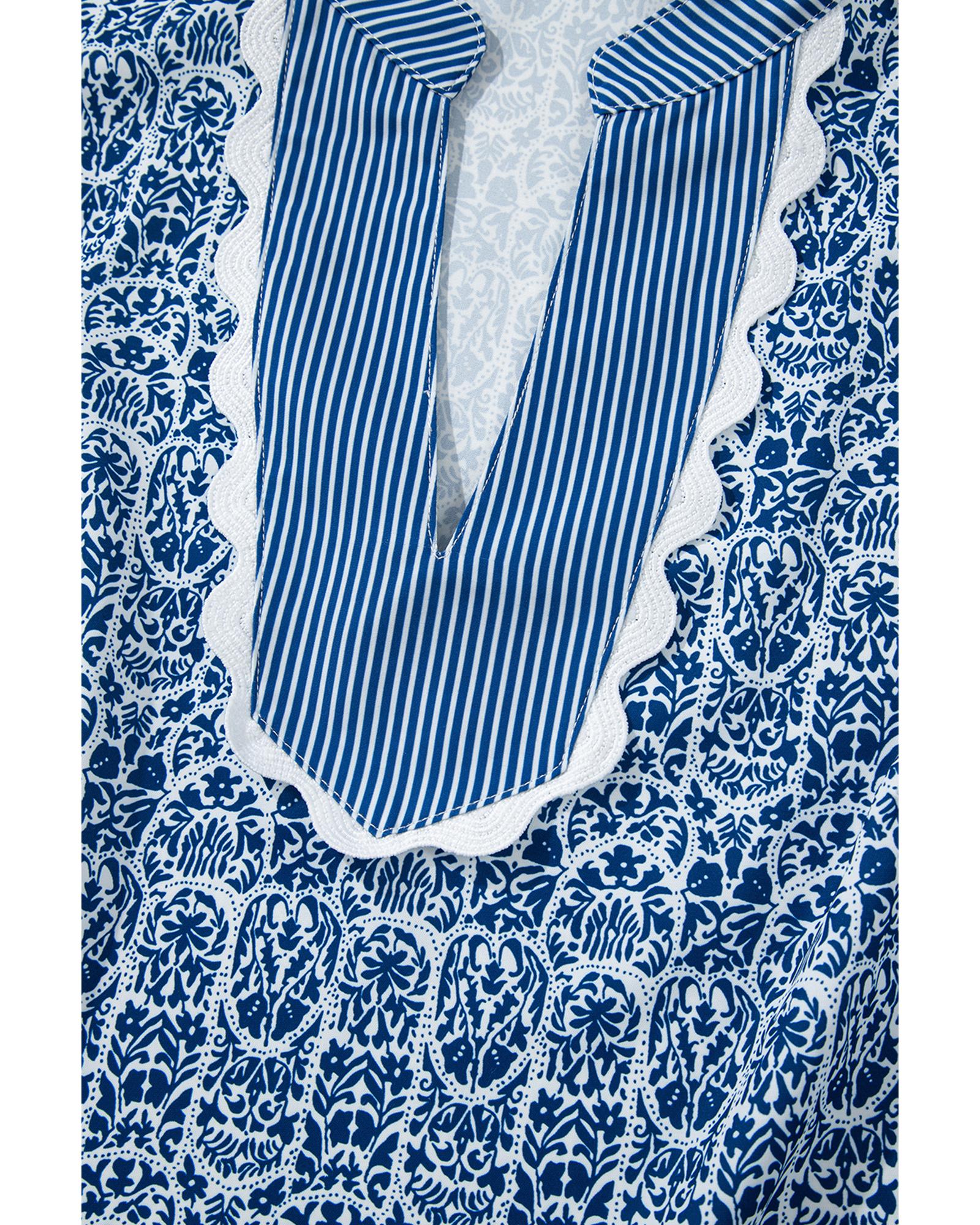 Blue Floral Striped Print Contrast Ric-rac Puff Sleeve Top – L