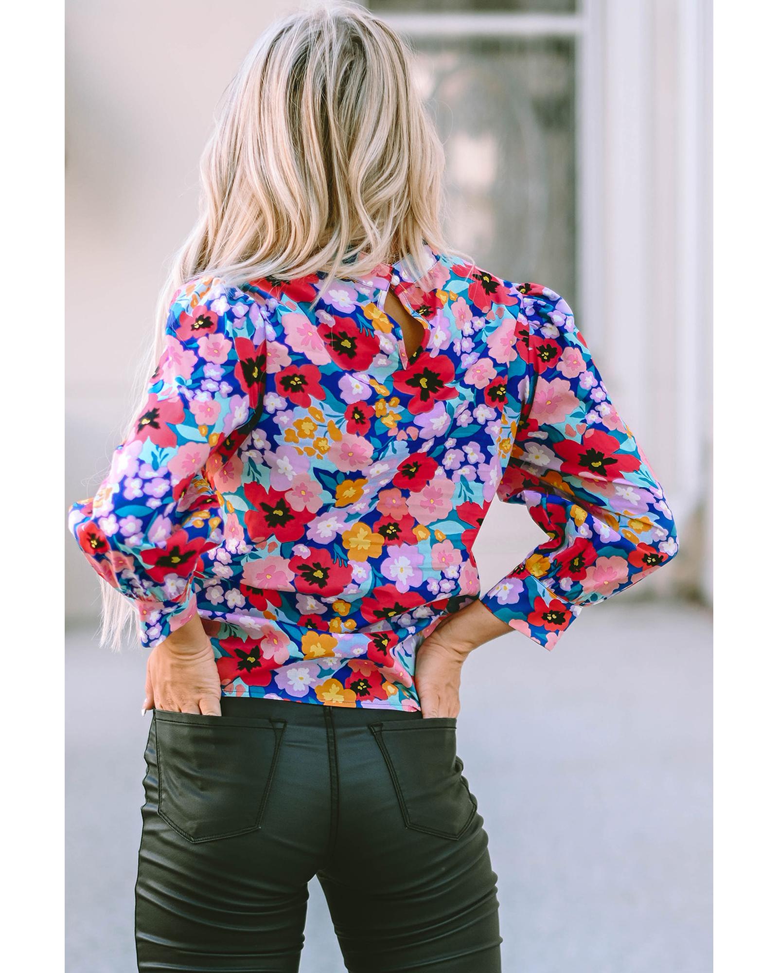 Blue Mock Neck Bubble Sleeve Floral Print Blouse – L