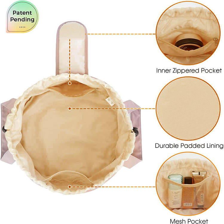 This large capacity portable drawstring makeup bag is designed for convenient travel and daily use. It offers ample space to organize various cosmetics and toiletries while maintaining a stylish appearance.