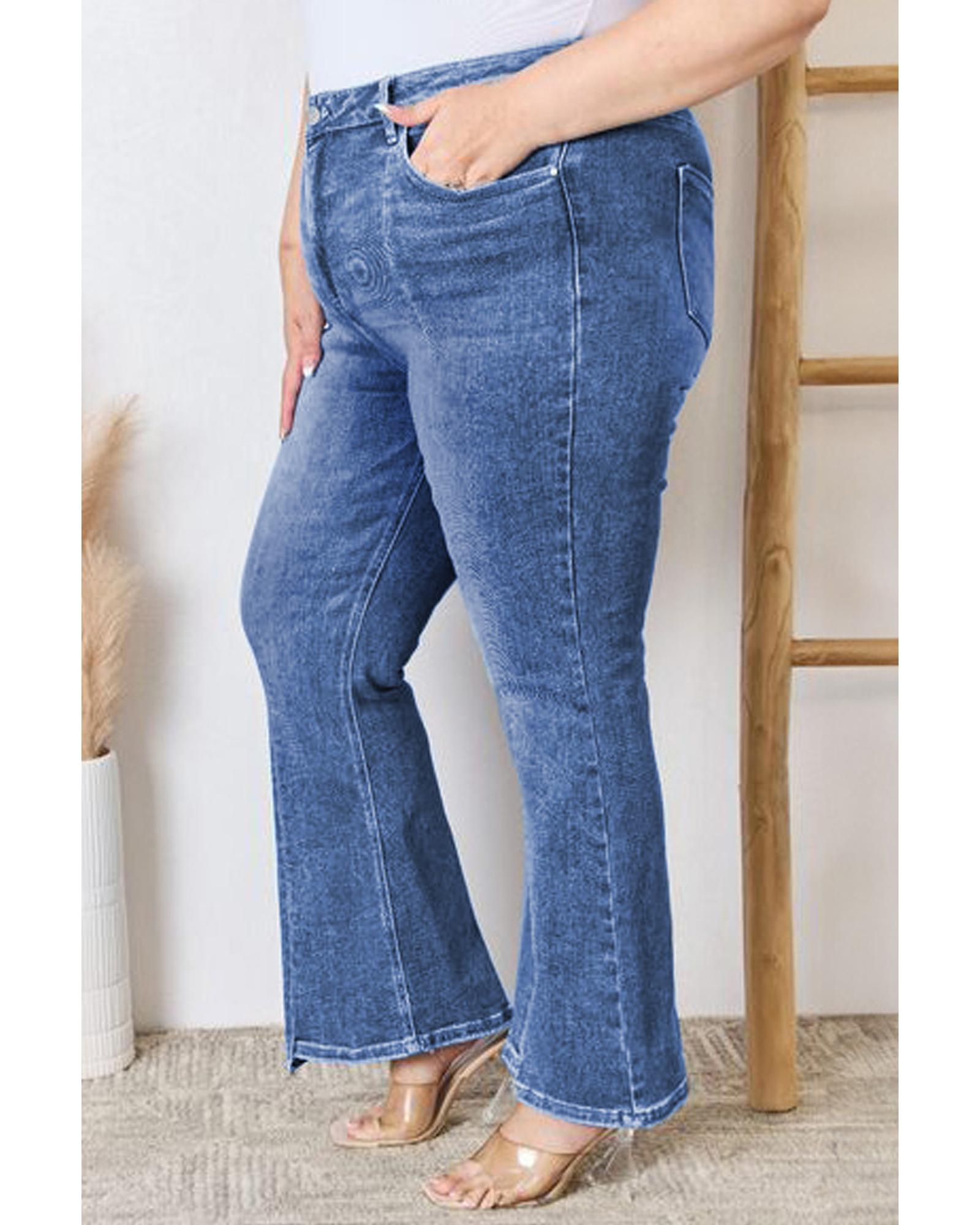These high waist flare jeans are designed with a trendy fitted look, offering a flattering silhouette for plus size individuals. Crafted from classic denim, they feature exposed seam detailing that adds an edgy touch. Perfect for achieving a chic yet casual style, these jeans are tailored specifically for a comfortable plus size fit.