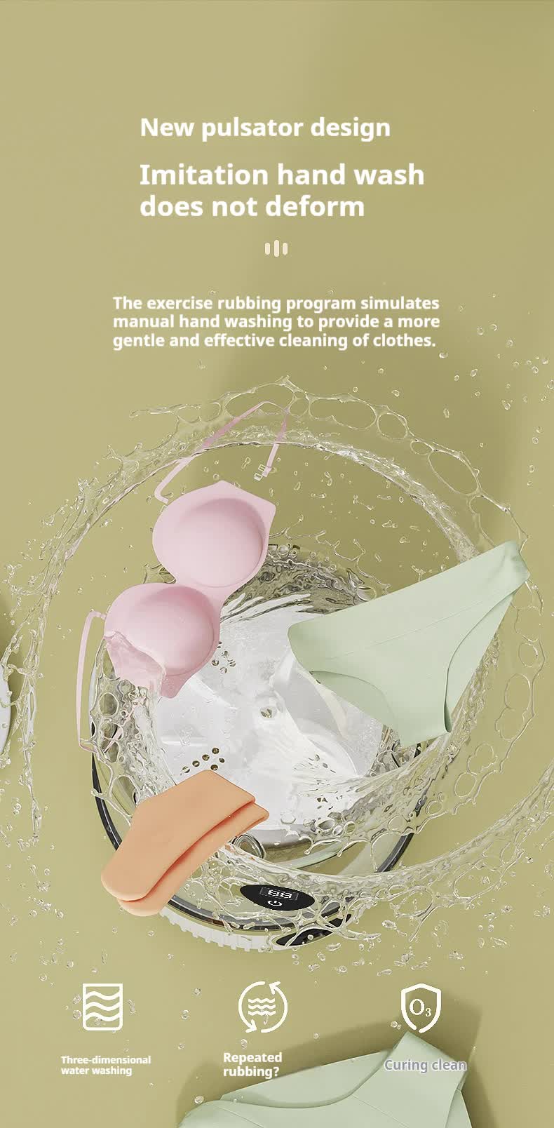 This portable mini washing machine offers a convenient solution for washing small items such as delicates, socks, and underwear. Its compact design makes it ideal for travel, dorms, apartments, and other small spaces. The wireless, rechargeable feature allows for use anywhere, providing an easy and gentle cleaning experience.