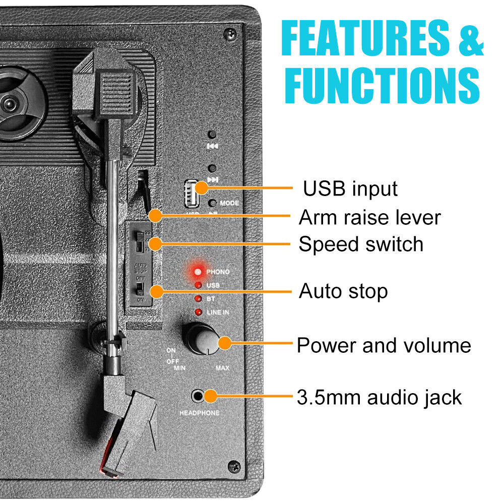 - Selectable rotation speeds of 33, 45, and 78 RPM to accommodate different vinyl records