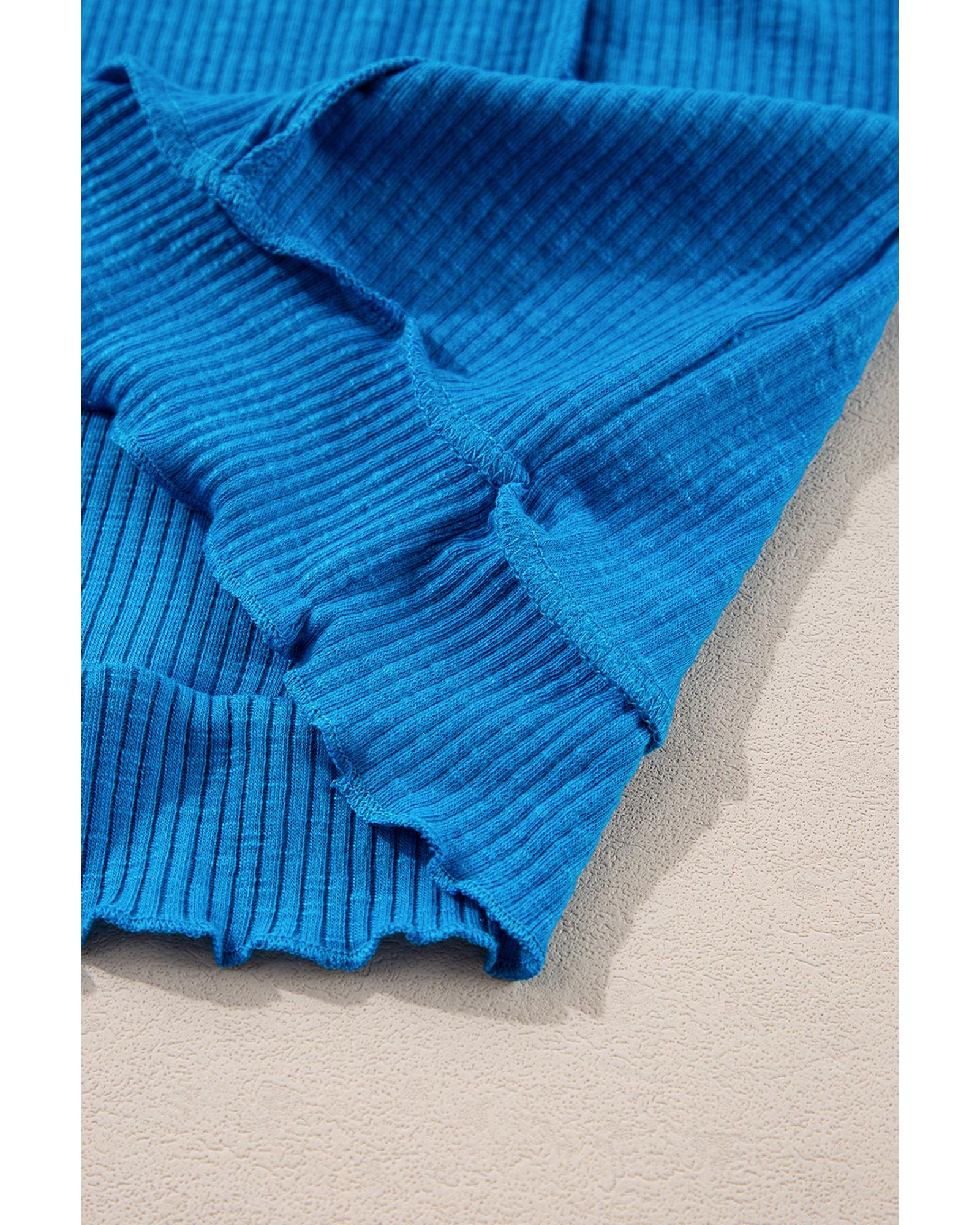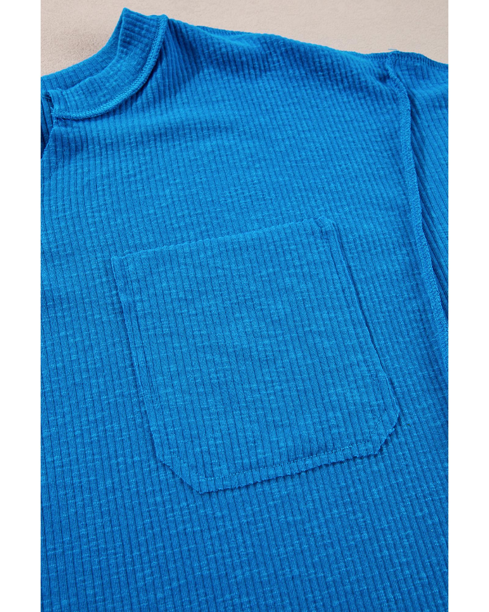 Blue Ribbed Exposed Seam Knit V Neck Long Sleeve Top – XL