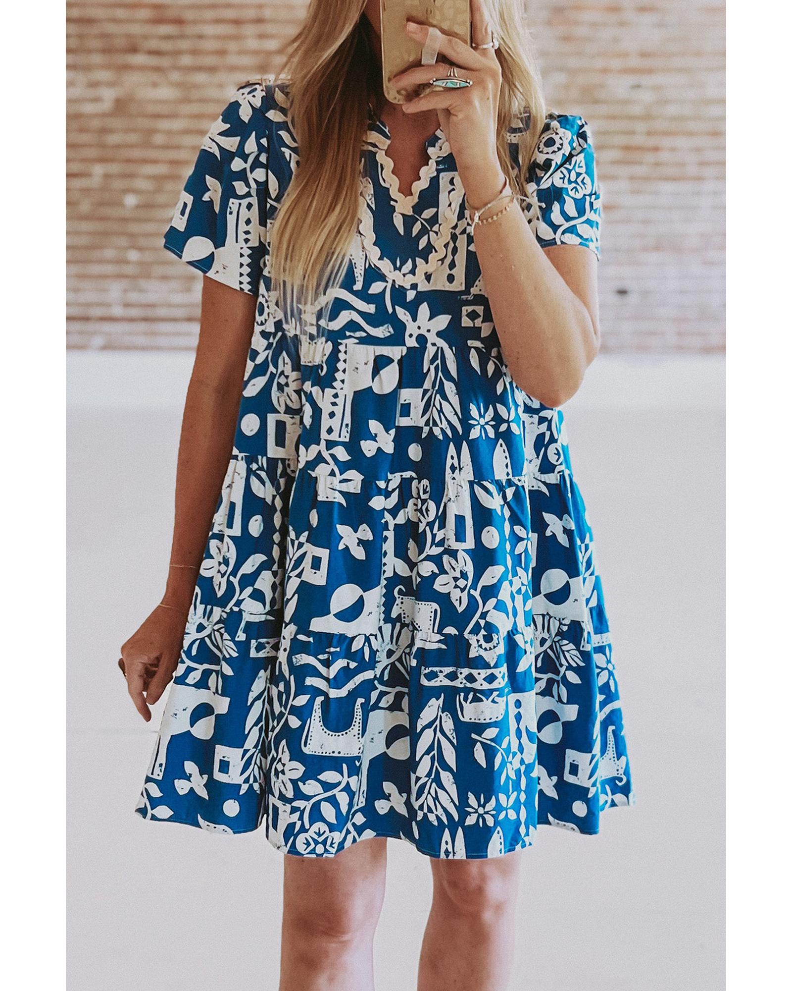 Blue Ricrac Trim Split Neck Floral Loose Dress – M