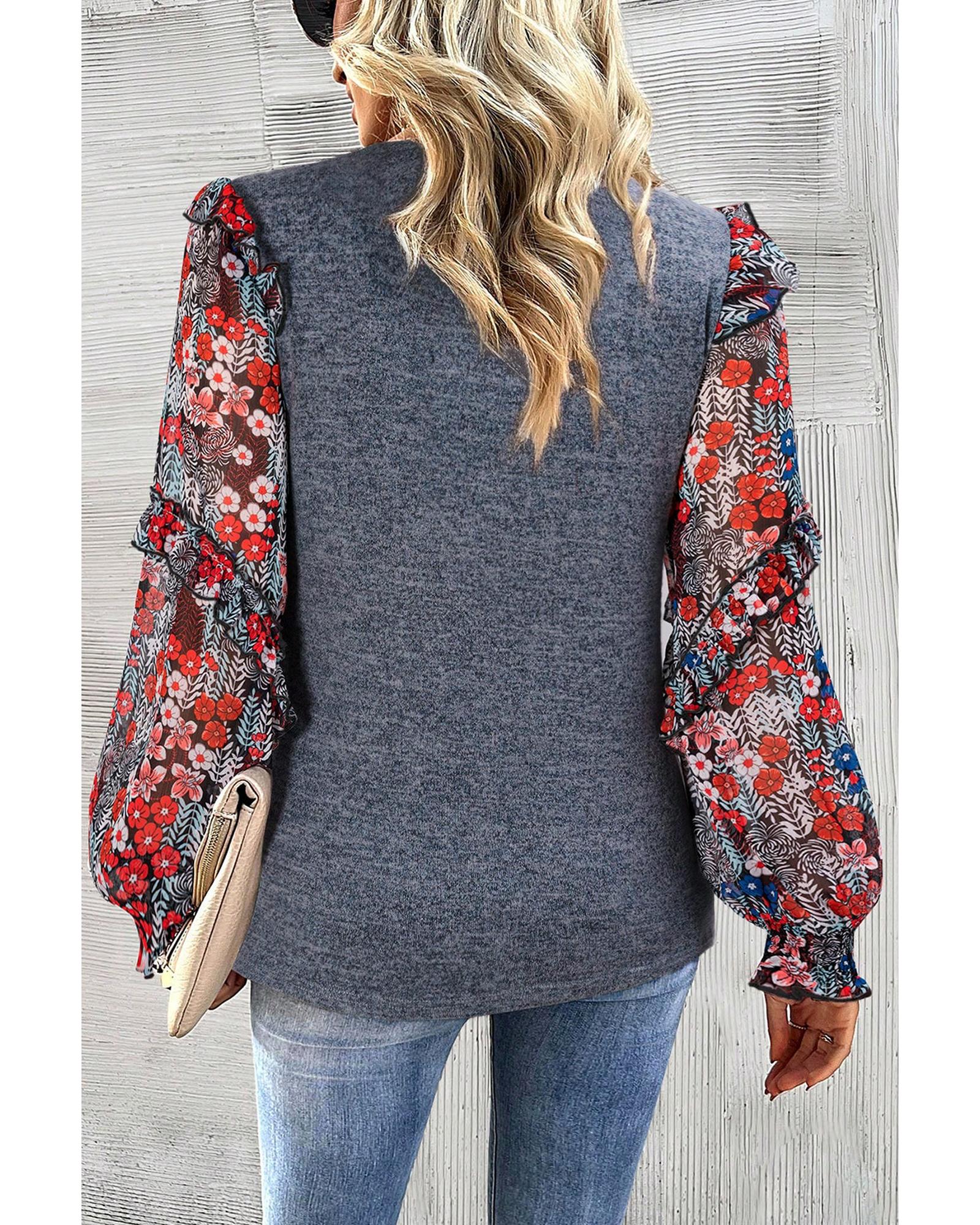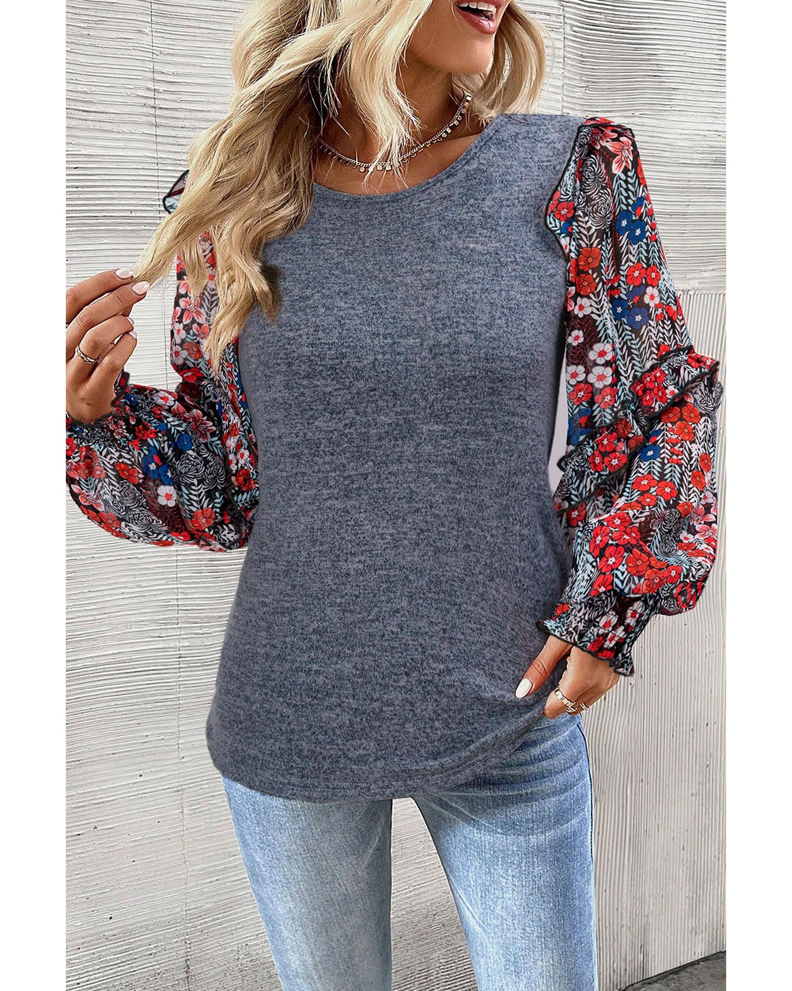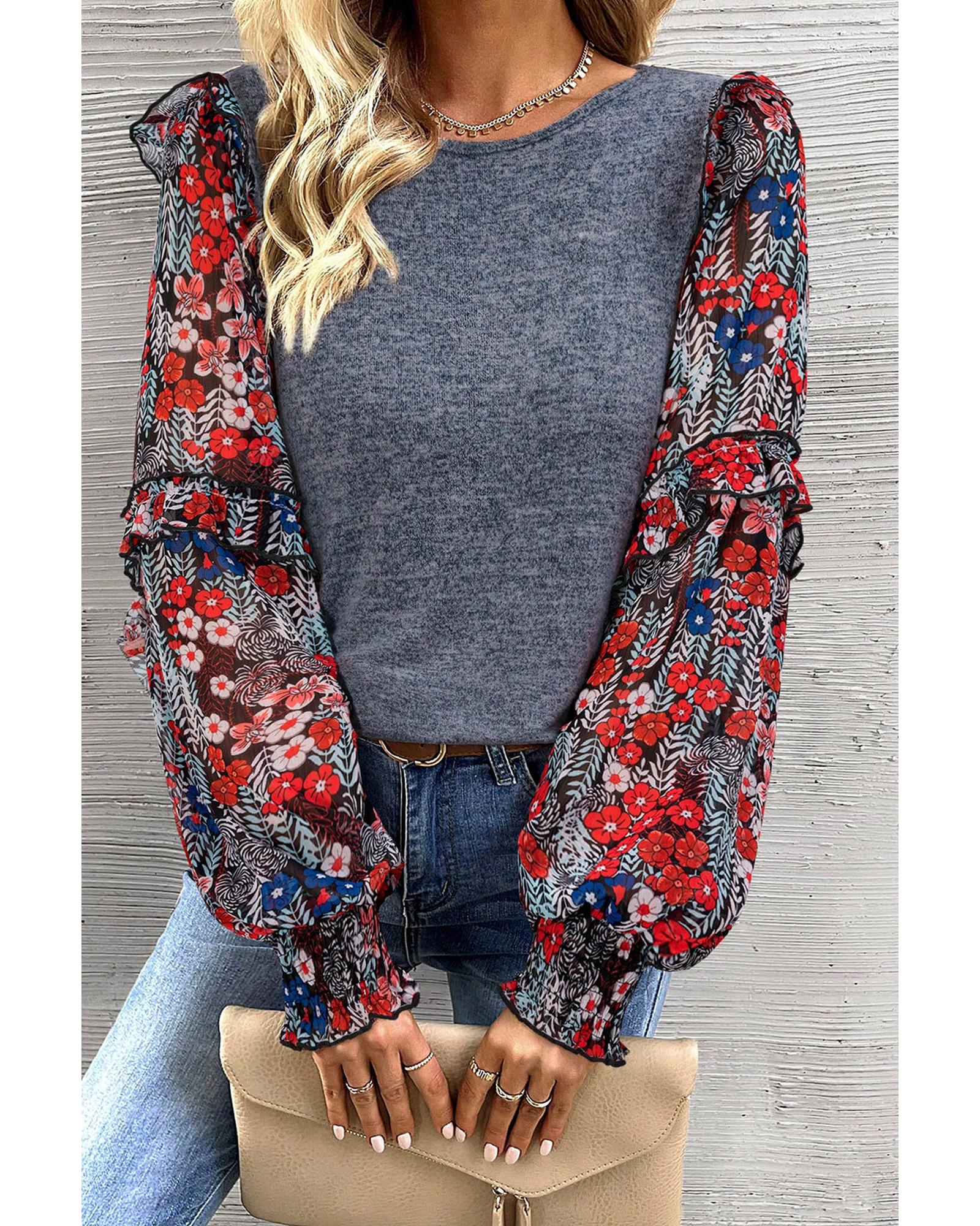Blue Ruffle Tiered Floral Sleeve Crew Neck Blouse – S