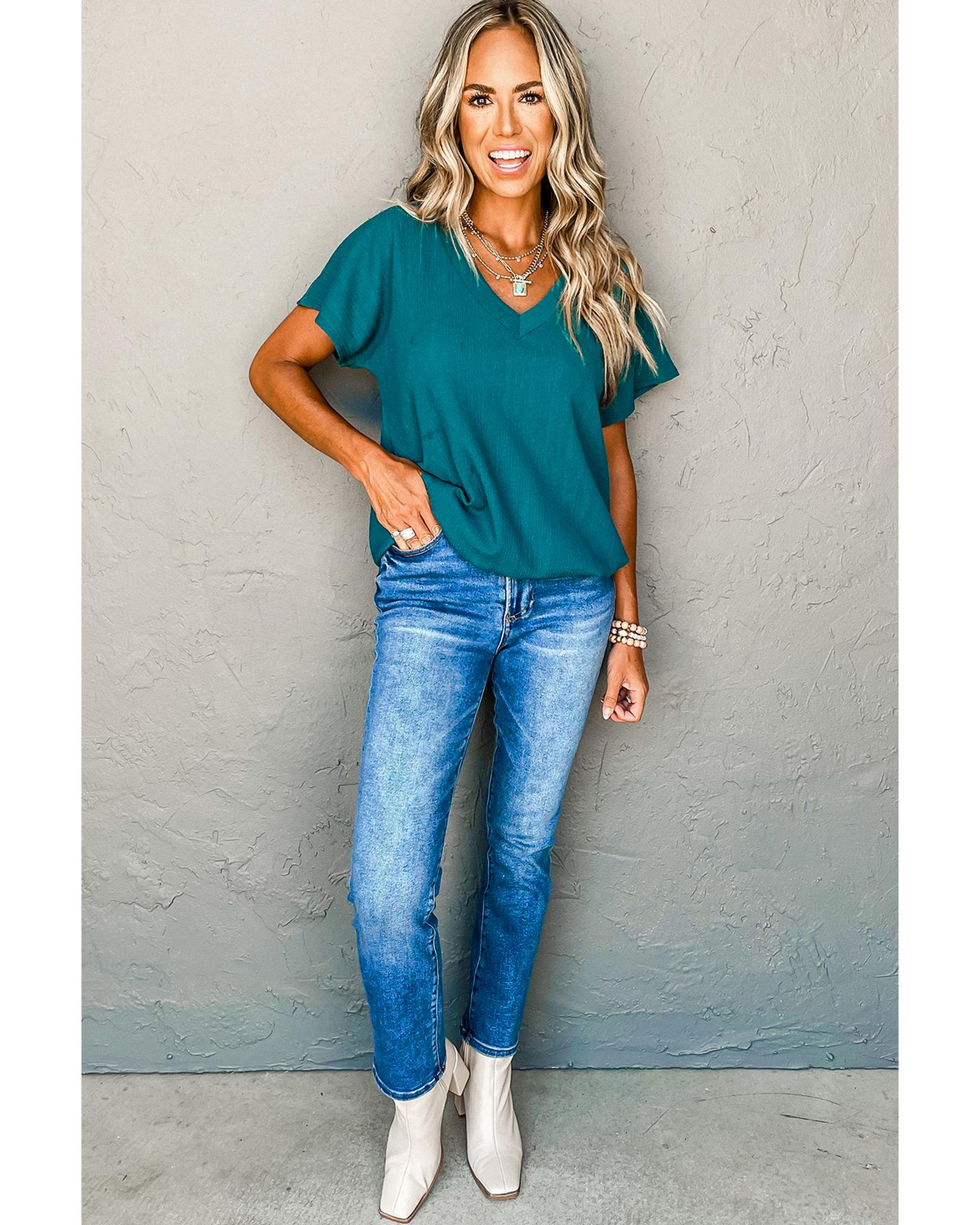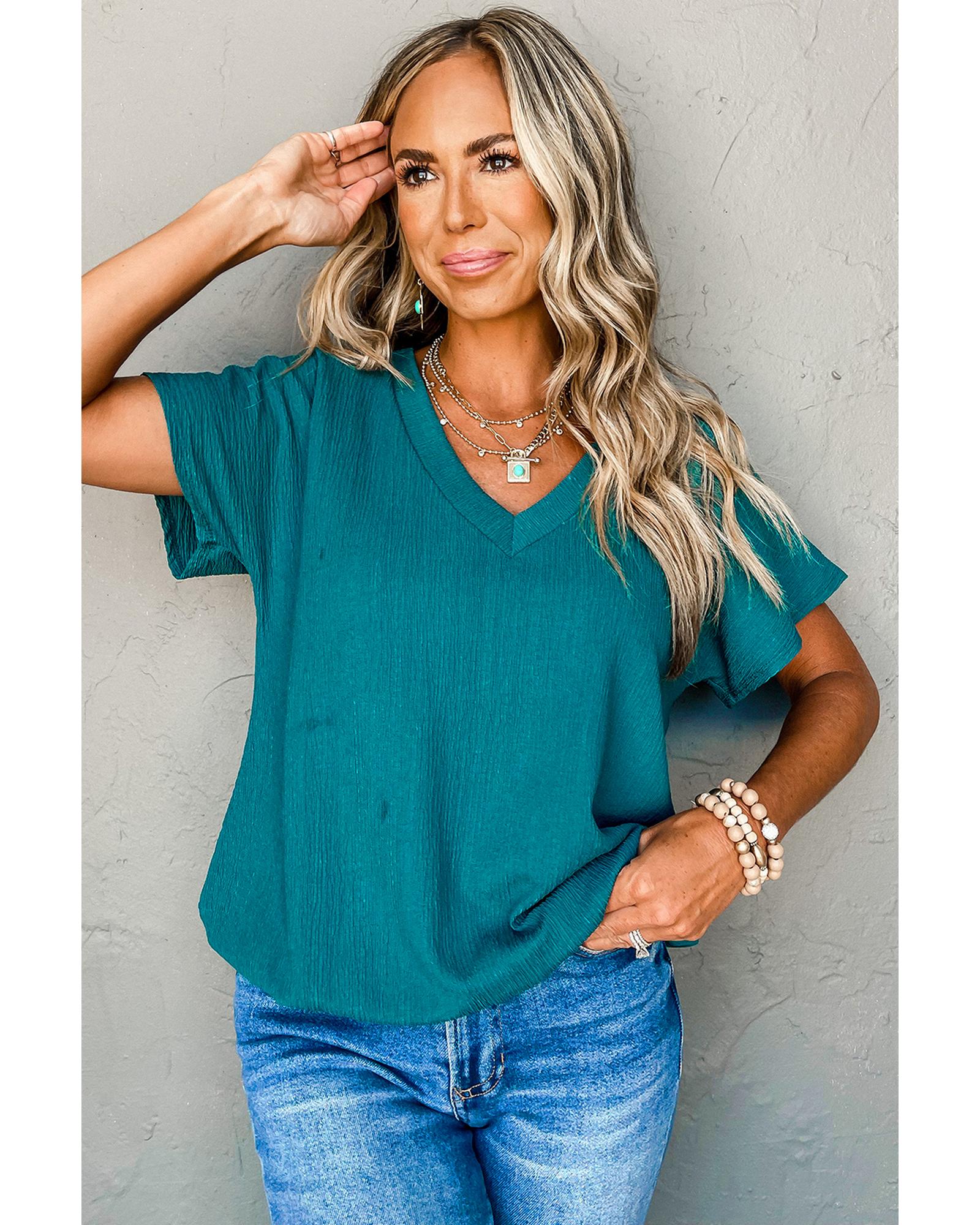 This Blue Sapphire Crinkled V Neck Wide Sleeve T-shirt combines a trendy fitted design with comfortable wear. Made from breathable fabric, it is ideal for summer and features a textured crinkled finish. Its versatile style makes it suitable for pairing with jeans, shorts, or skirts, perfect for both men and women.