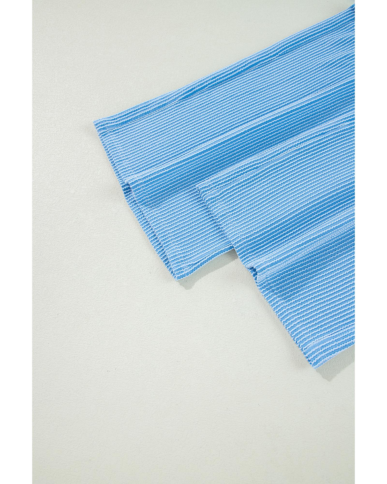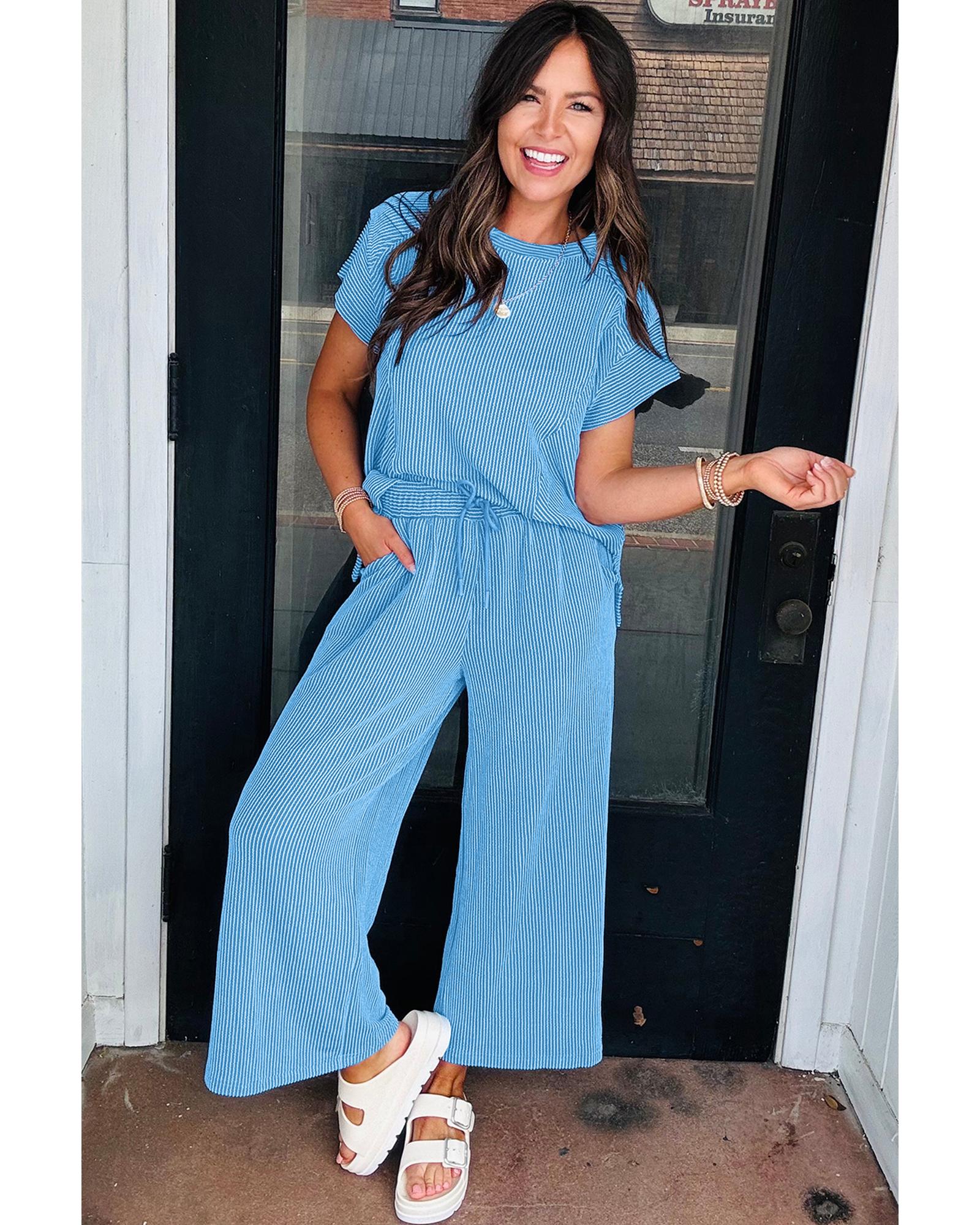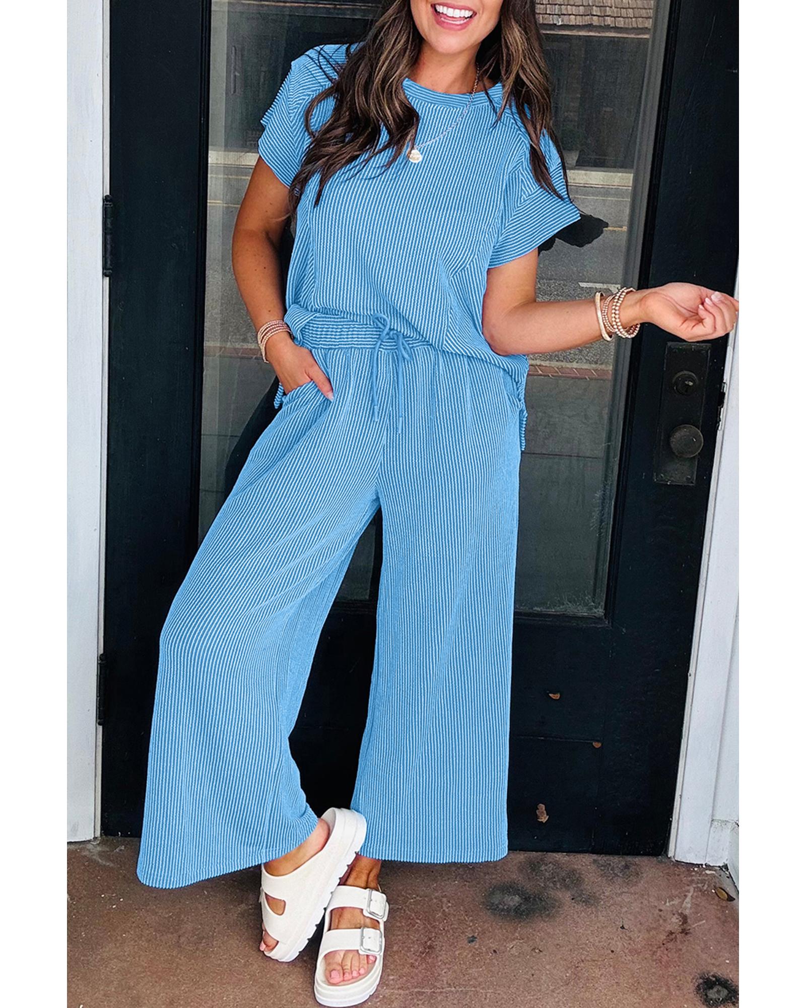 Blue Solid Corded Knit Short Sleeve T Shirt and Wide Leg Pants Set – S