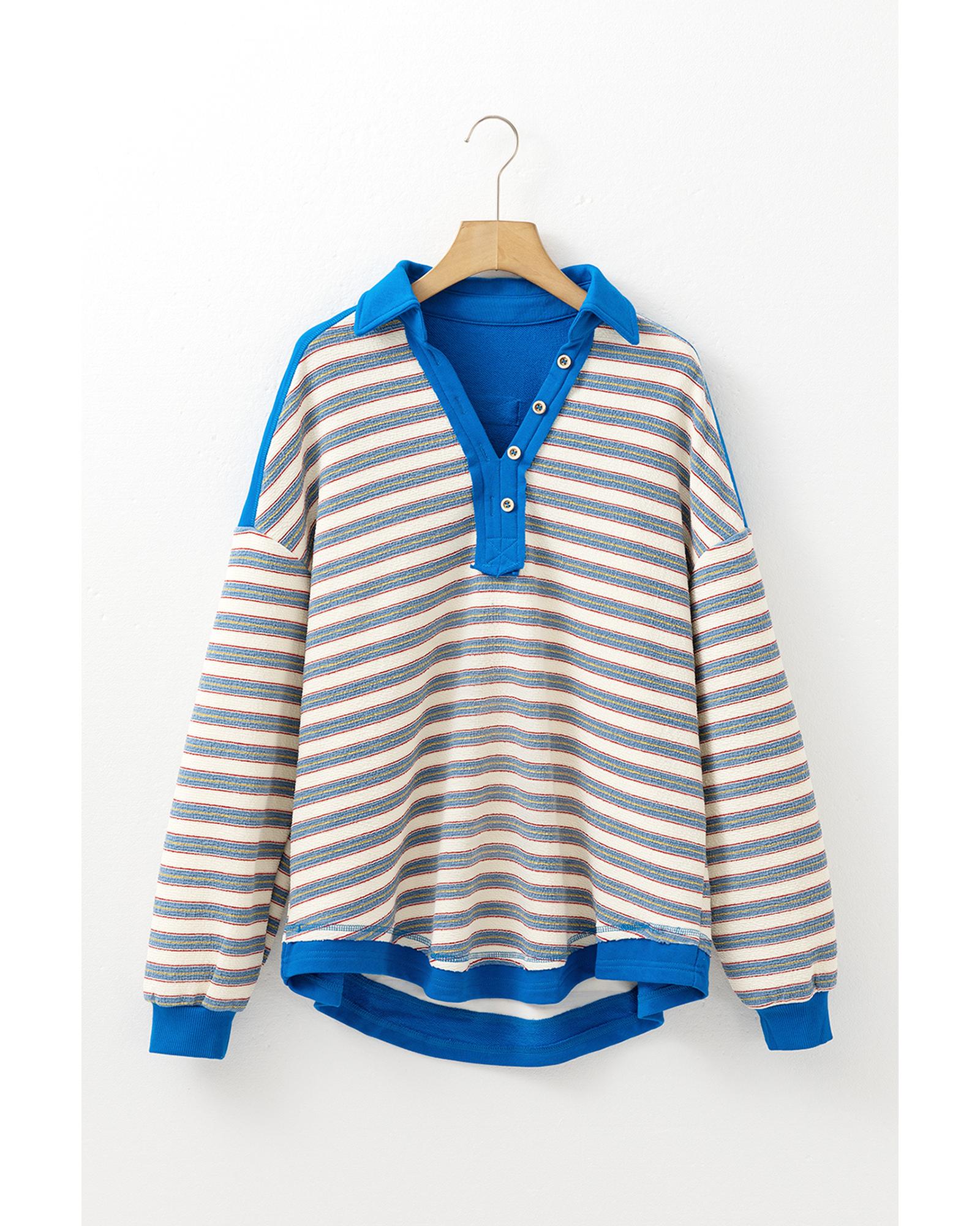 Blue Stripe Buttoned V Neck Collared Drop Shoulder Top – XL