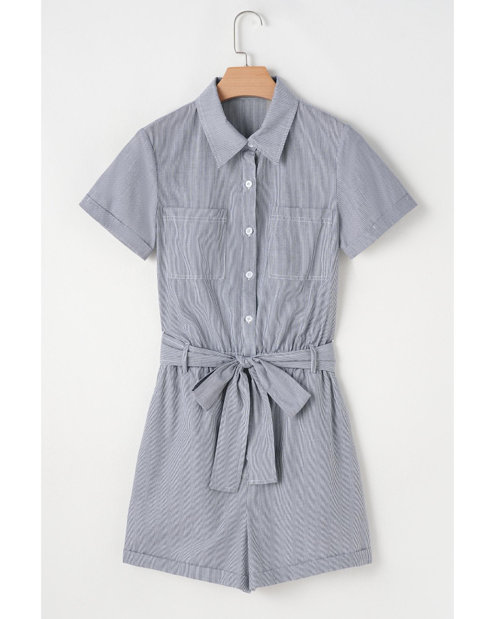 This romper features a stylish striped print combined with functional design elements, making it suitable for casual day wear. It offers a comfortable fit with practical details such as chest pockets and a belted high waist, creating a flattering silhouette. The short sleeves add to the overall comfort, making it ideal for warm weather.