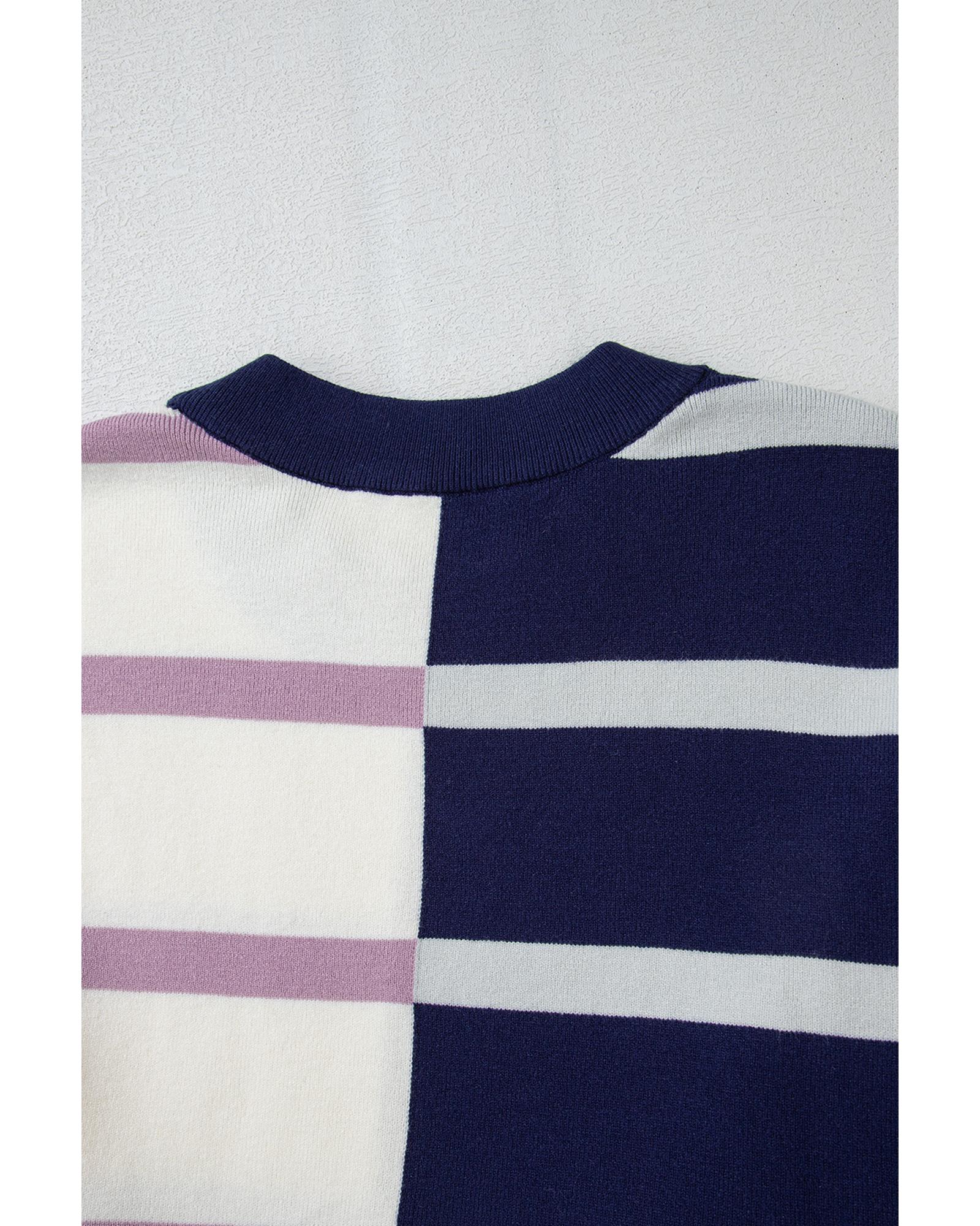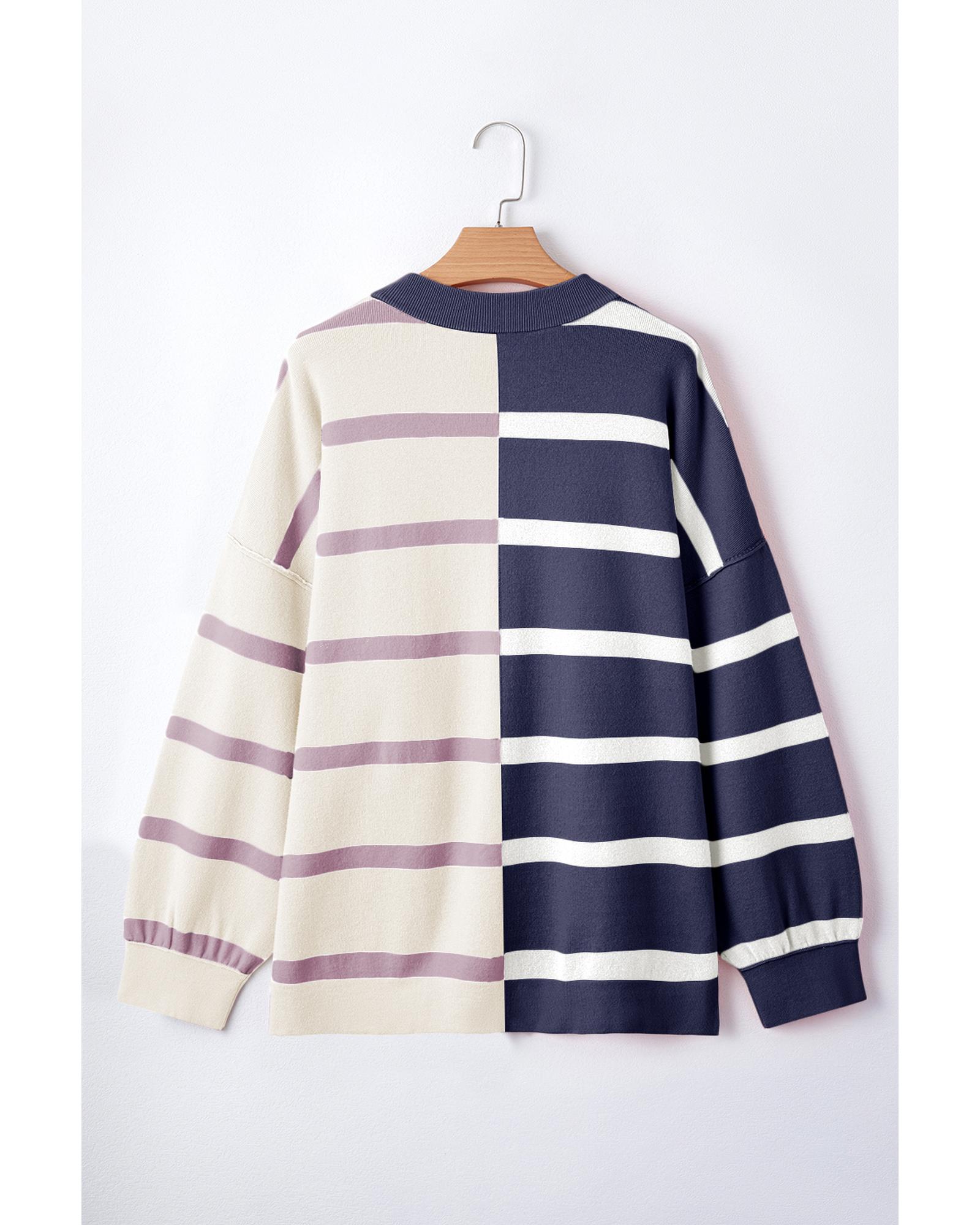 This oversized sweater features a trendy blue stripe colorblock design, offering a fashionable and comfortable option for chilly days. Its versatile style makes it suitable for various body shapes and easy to pair with different types of pants, making it a practical addition to any wardrobe.
