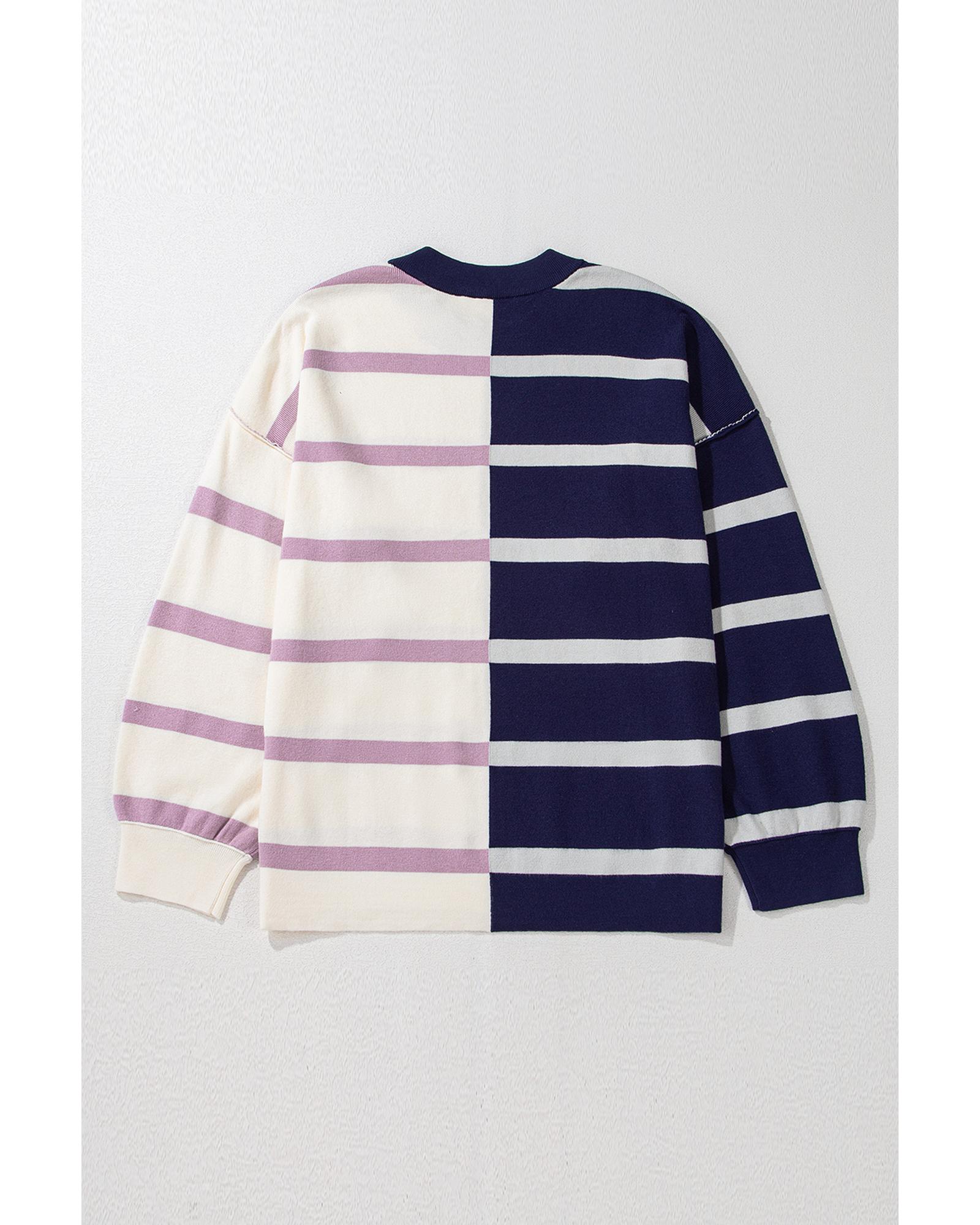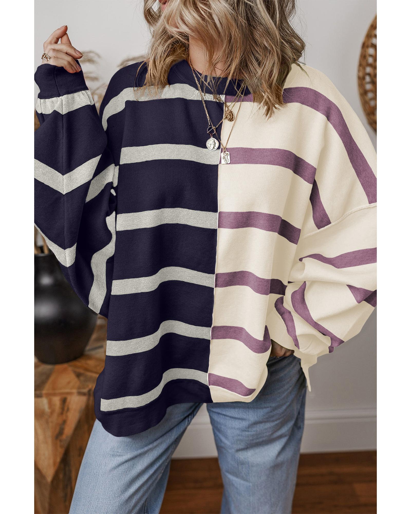 This oversized sweater features a trendy colorblock design with bold blue stripes, making it a fashionable choice for various casual occasions. Its relaxed fit provides comfort and versatility, suitable for different body shapes and styling preferences.