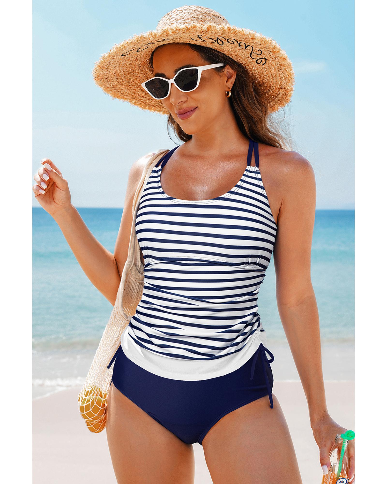 Blue Stripe Drawstring Tummy Control Mix-and-match 2pcs Tankini Swimsuit – XL