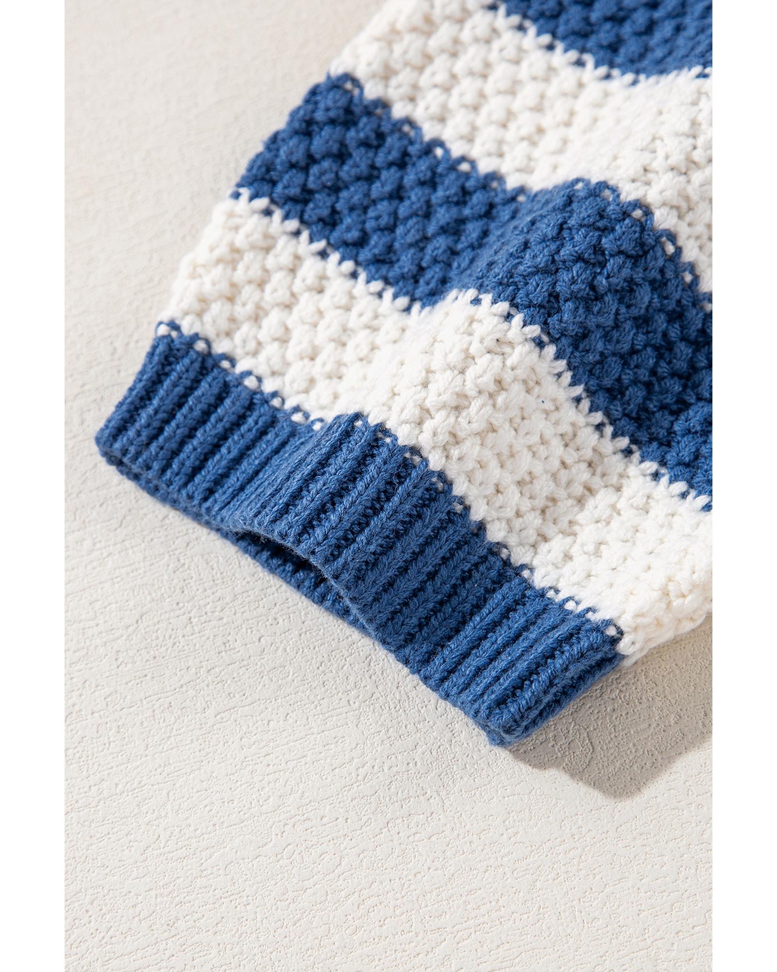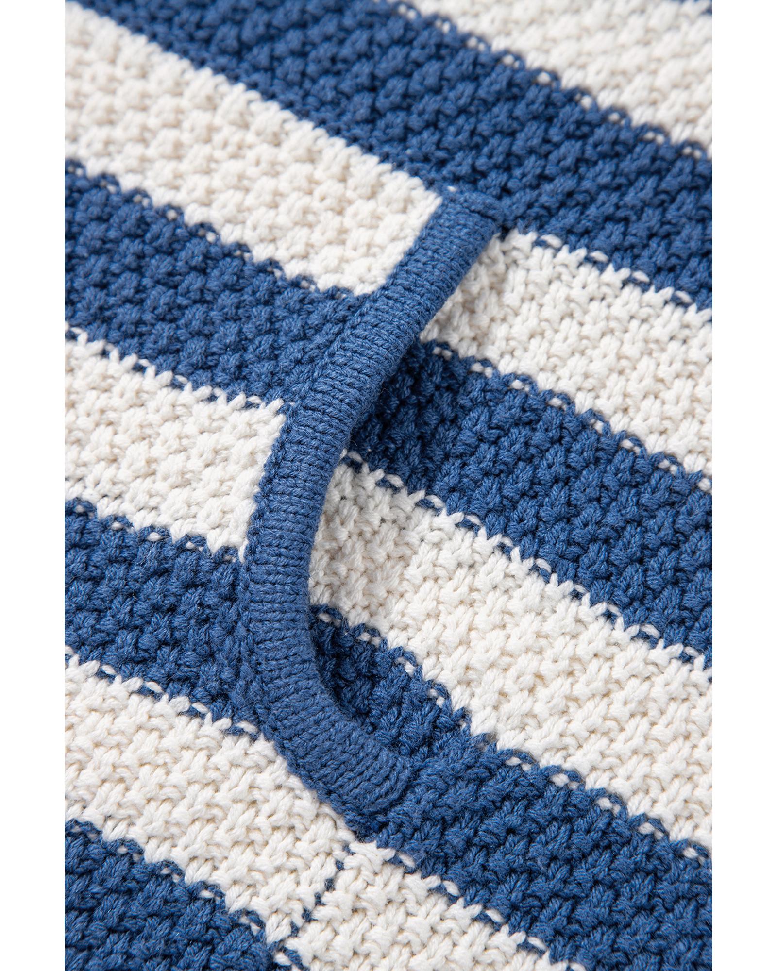 Blue Stripe V Neck Pocketed Drawstring Hooded Sweater – M