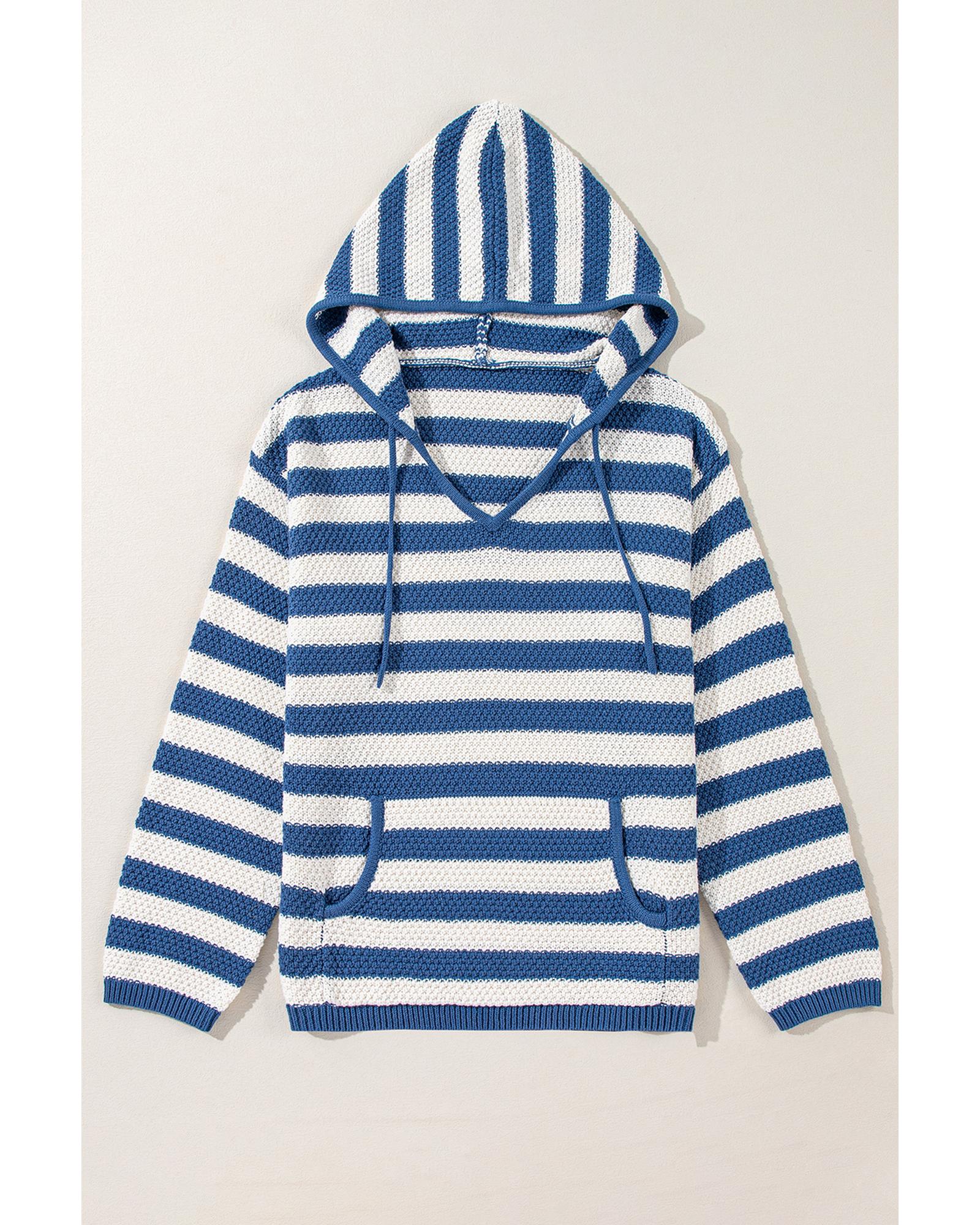 This V neck hooded sweater features a stylish blue stripe pattern and a practical pocket design, offering a comfortable and trendy look suitable for various casual occasions. The sweater combines classic style with functional details, making it a versatile addition to your wardrobe.