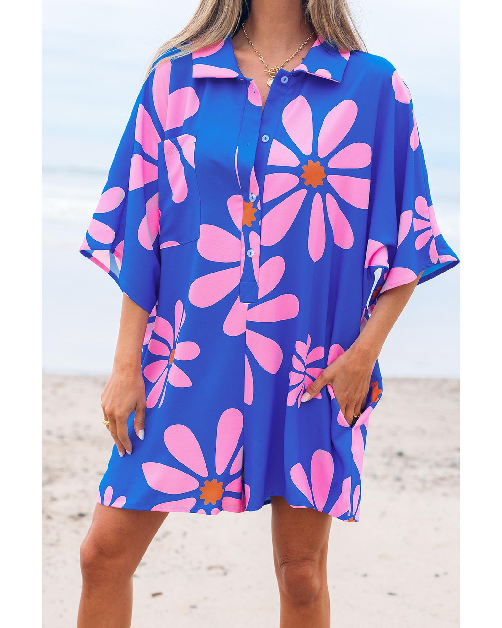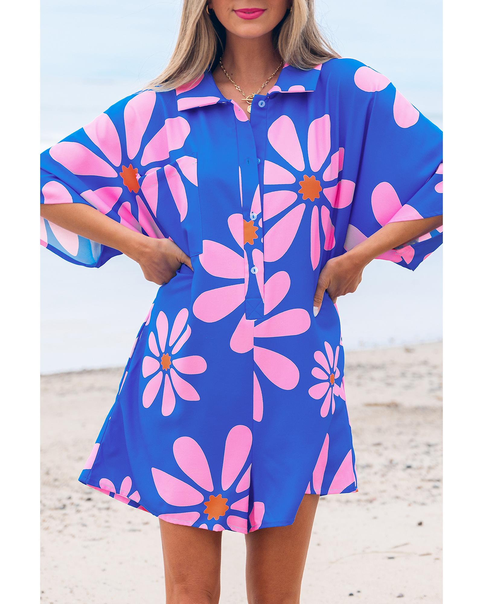 Blue Summer Flower Print Shirt Collar Button Front Loose Romper – S