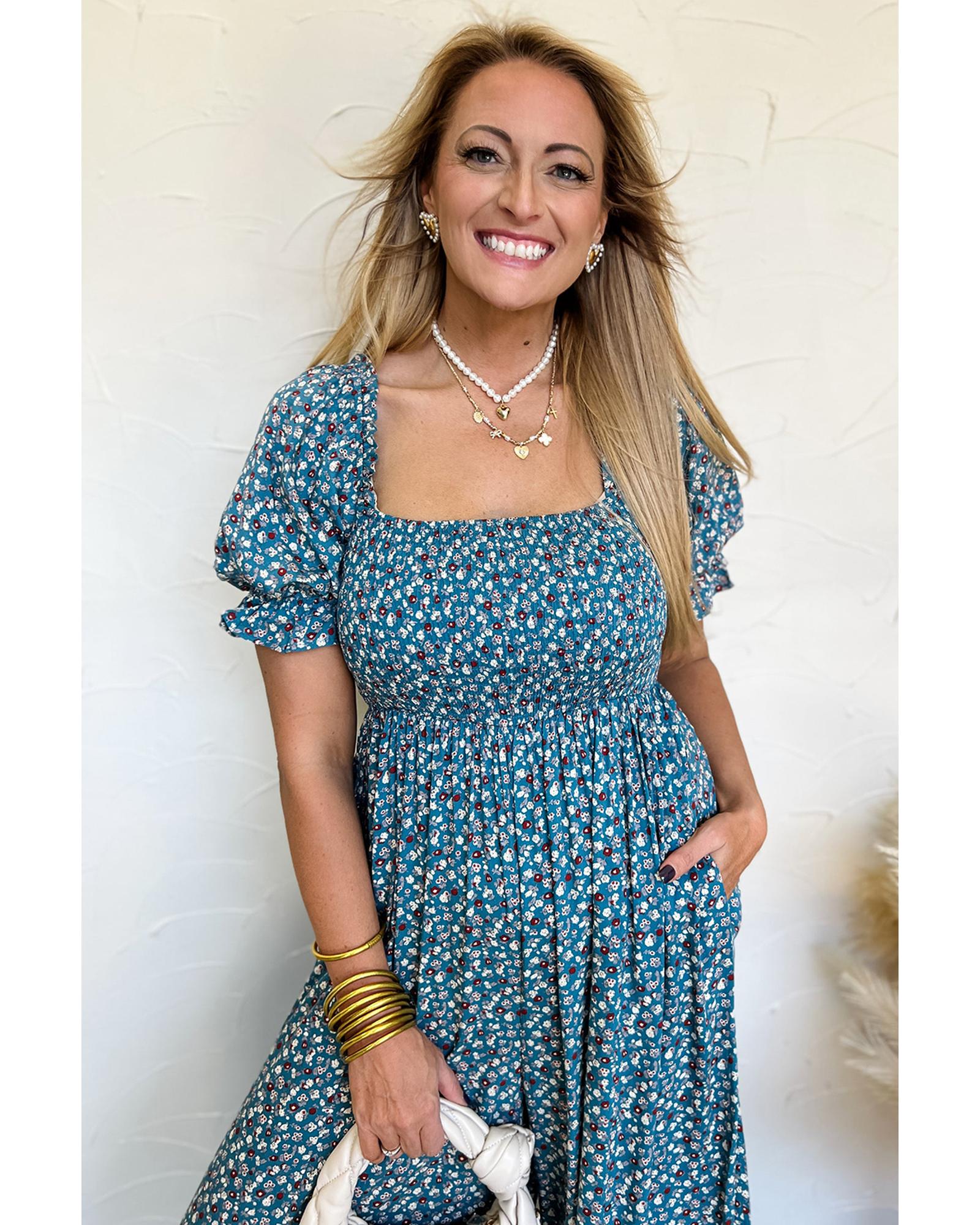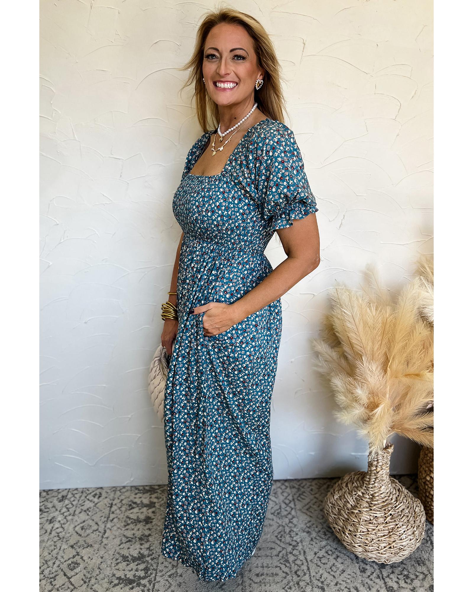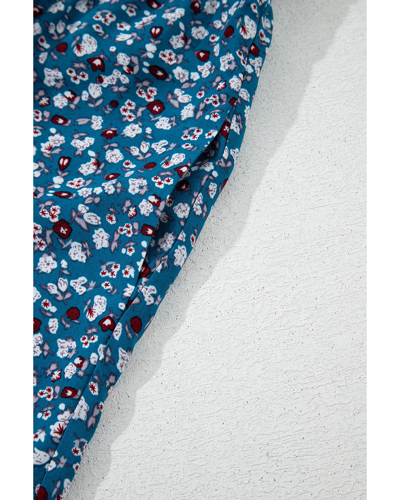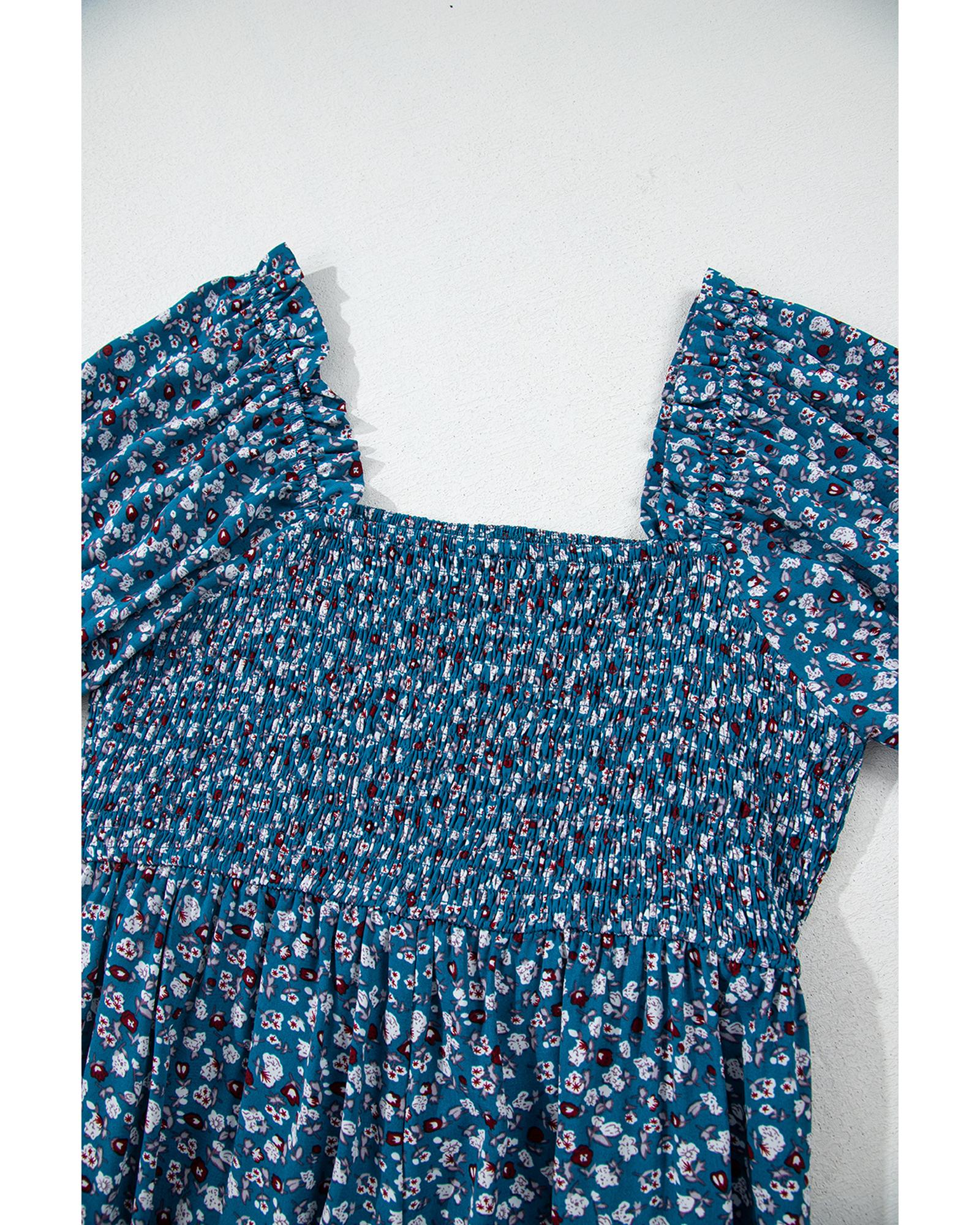 This vintage-inspired floral jumpsuit features a bohemian aesthetic with a comfortable and stylish design. It combines a smocked bodice, short puff sleeves, and wide-leg silhouette to create a relaxed yet fashionable look suitable for various occasions.