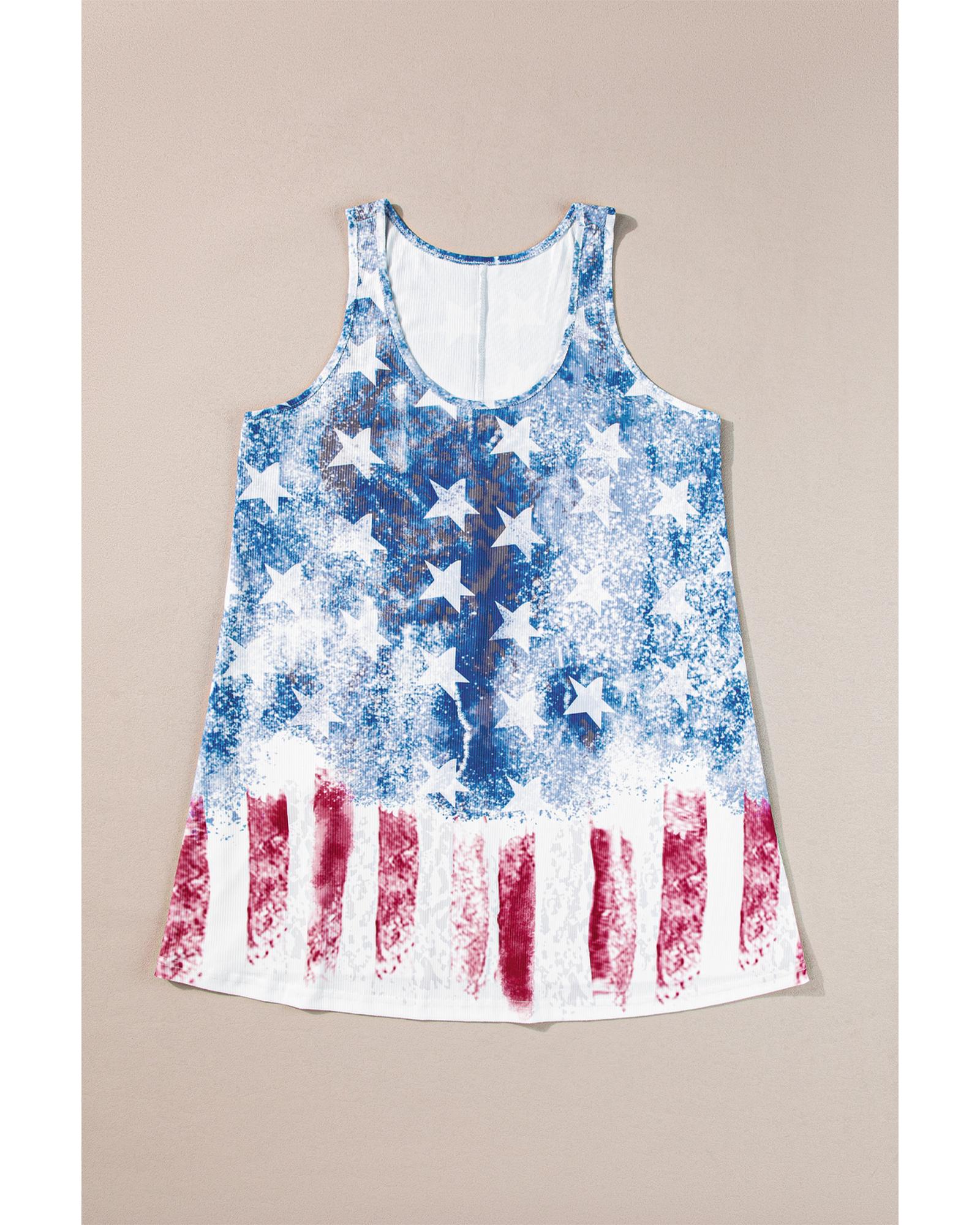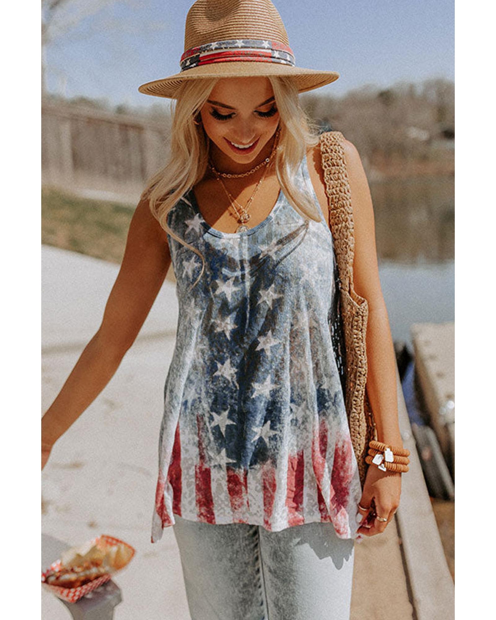 This sleeveless tank top features a vintage washed finish with a flag print design, offering a trendy and relaxed fit. Its lightweight knit material and classic American flag pattern make it suitable for casual wear and various body types.