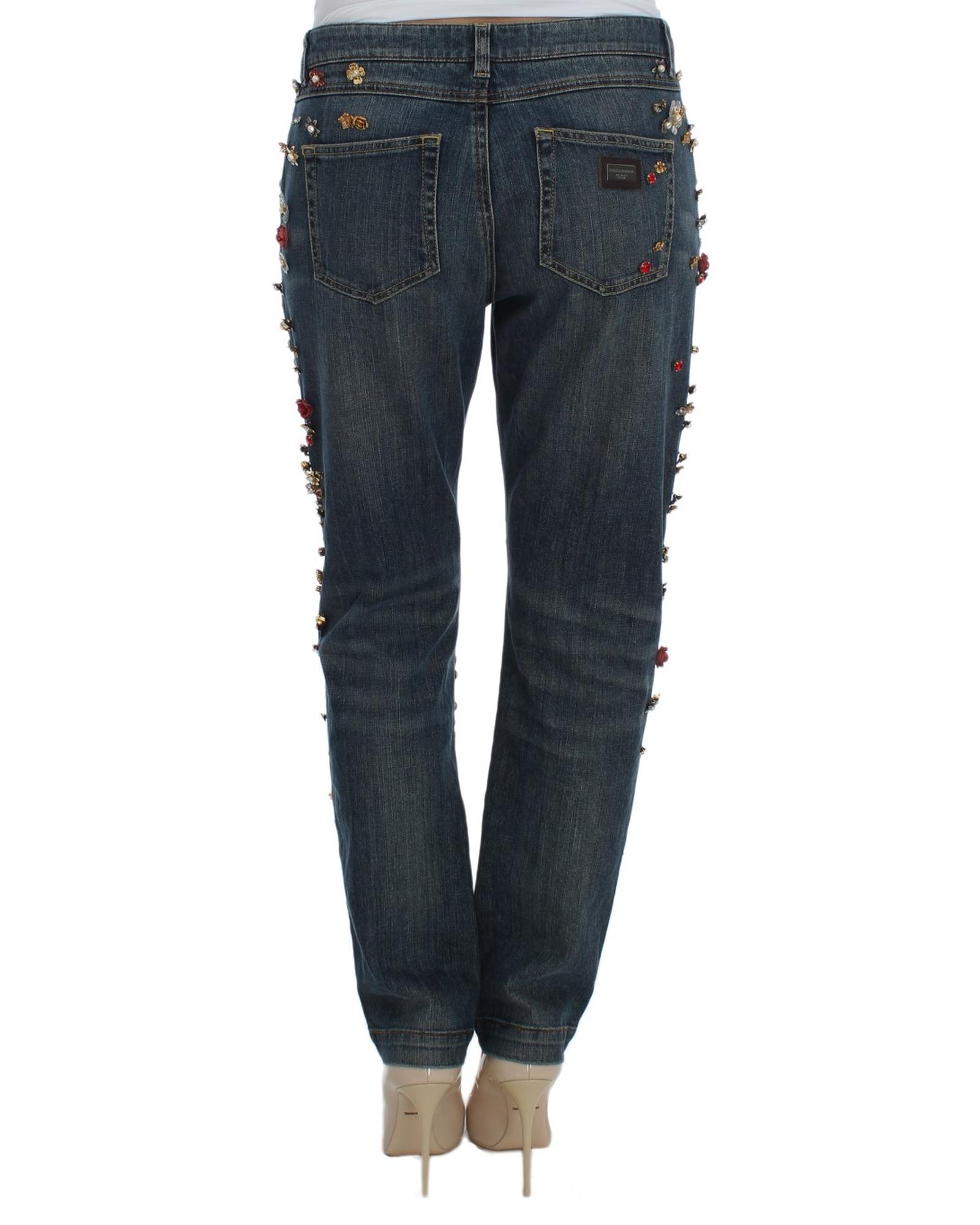 Blue Wash Crystal Heart Roses Embellished Enchanted Sicily Boyfriend Jeans 38 IT Women