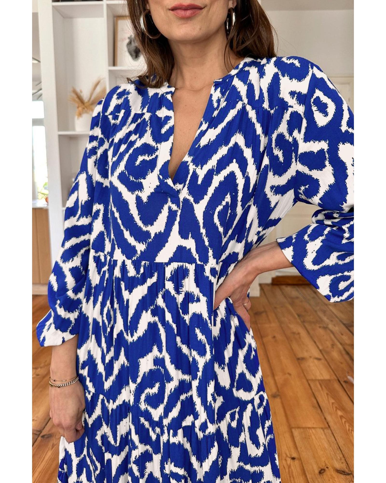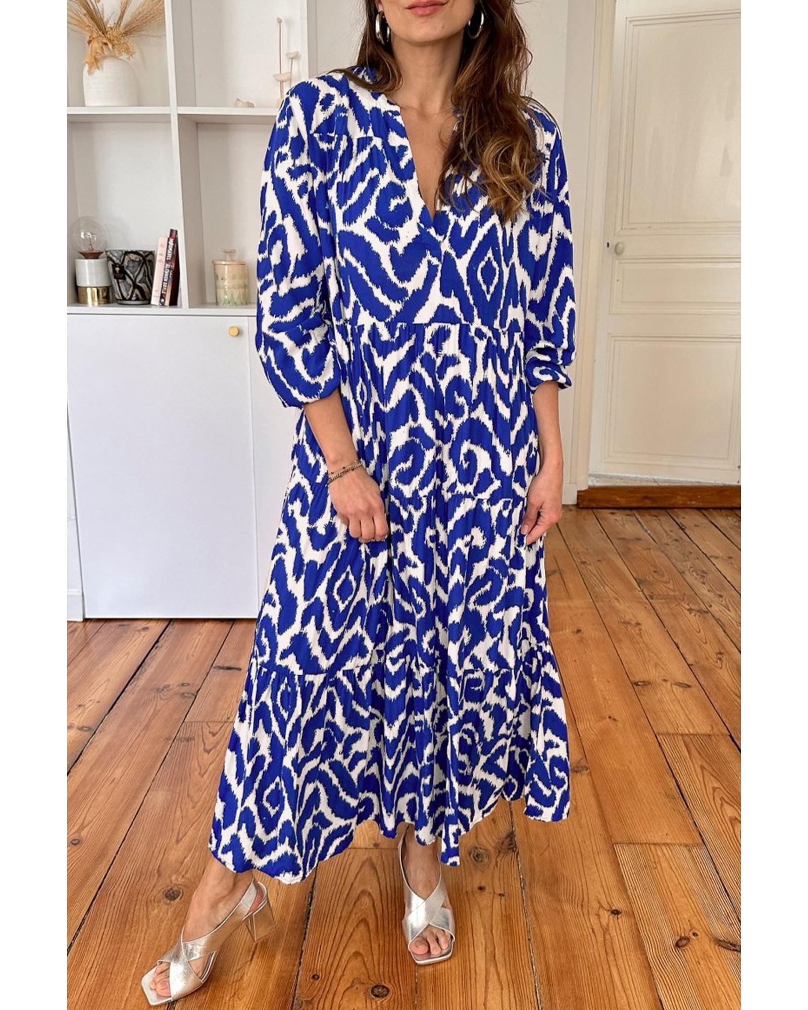 This maxi dress features an abstract geometric print inspired by Western design, offering a trendy and stylish look. It is designed with a flattering V-neckline and a loose fit silhouette to ensure comfort and elegance. The dress is suitable for various occasions and provides a fashionable statement with its unique pattern.