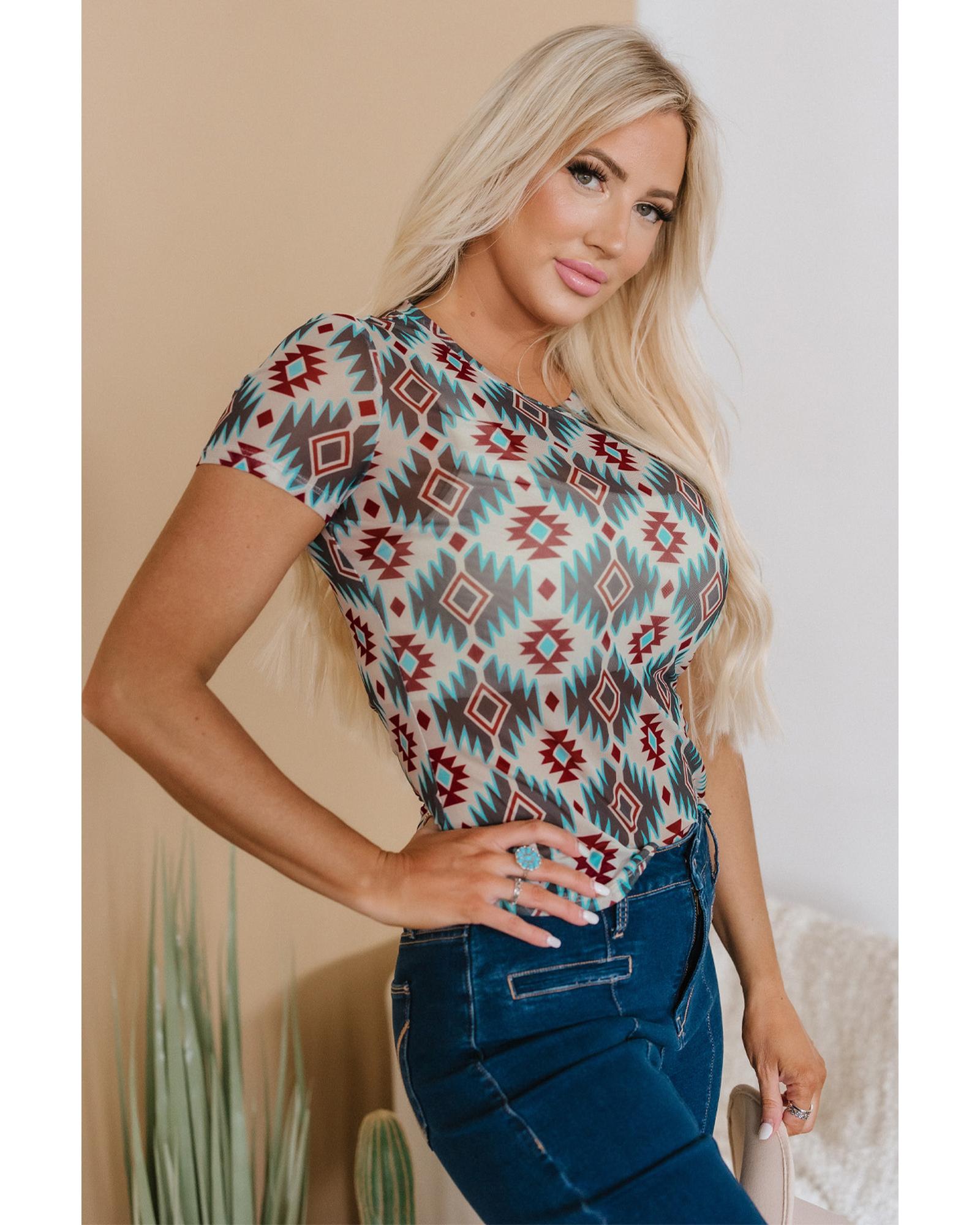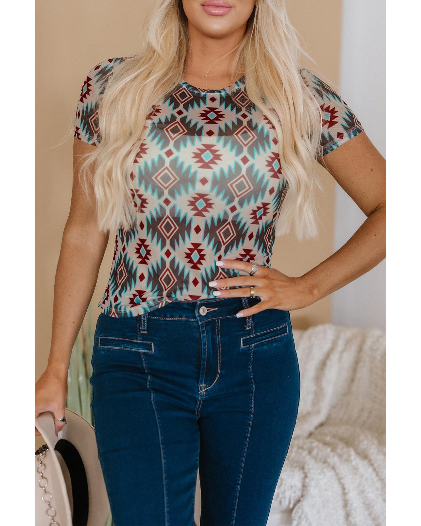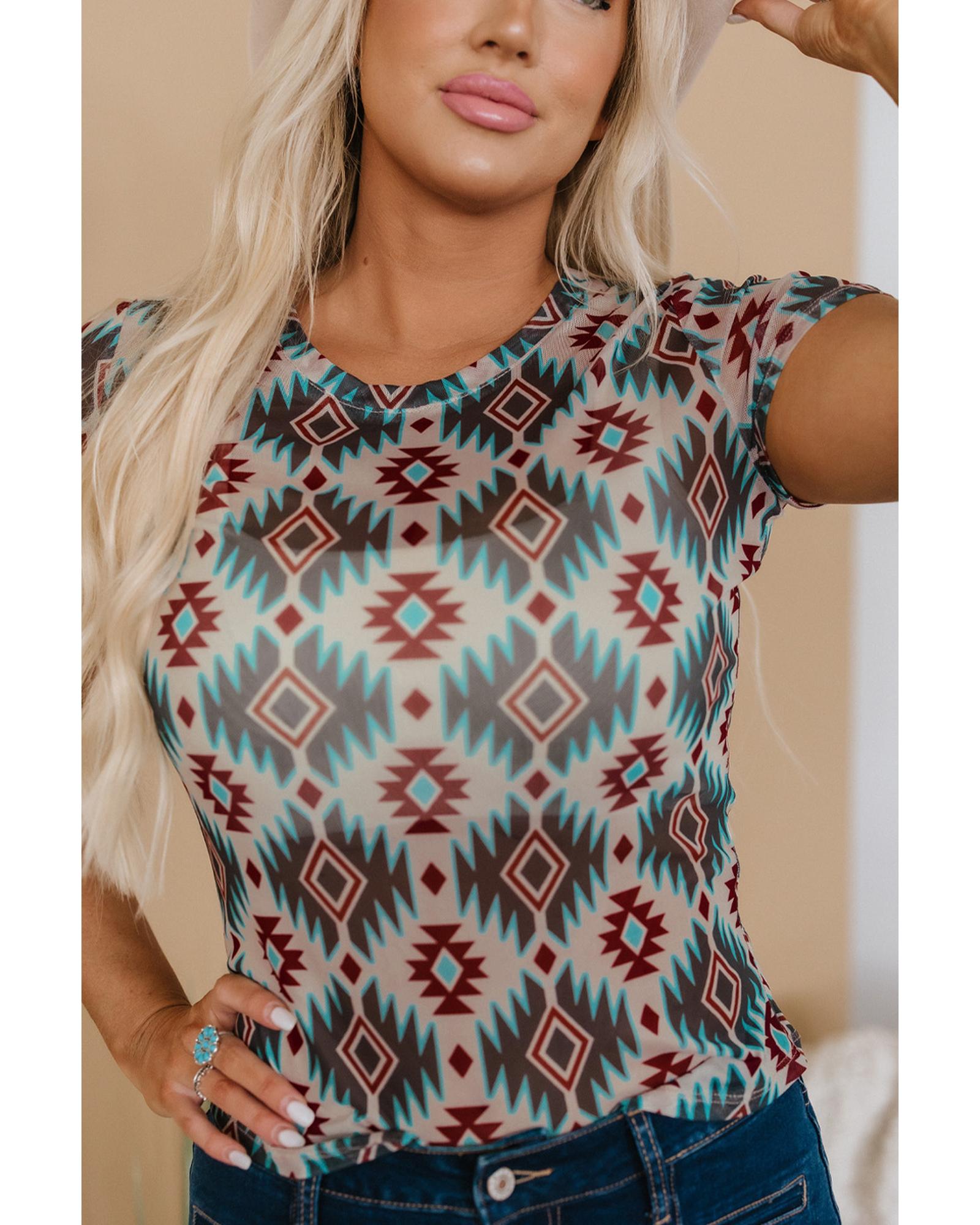 This slim fit mesh T-shirt features a striking Western Aztec print, offering a trendy and stylish appearance. Designed for versatility, it is suitable for both casual and active occasions, providing comfort and a modern look.
