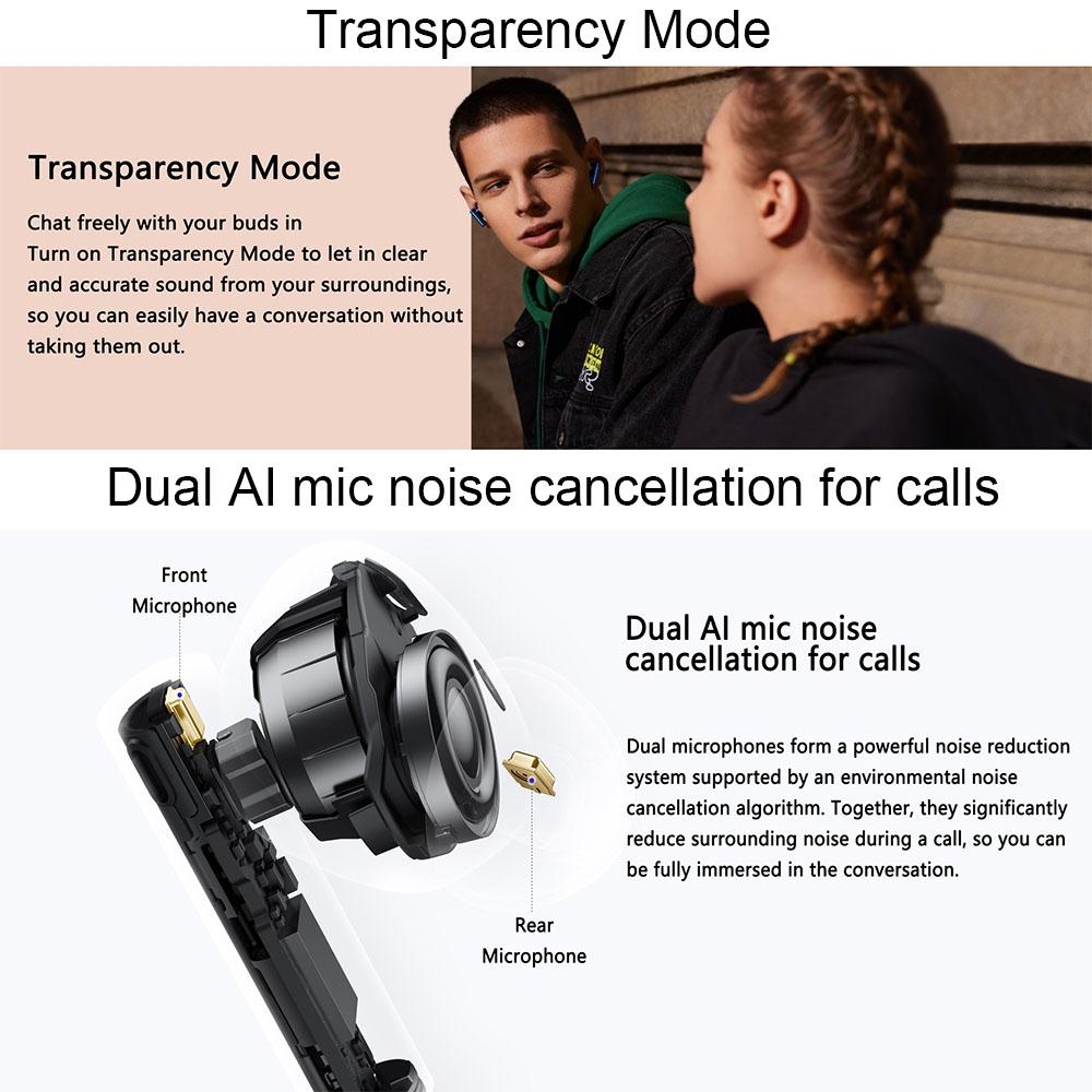 • Dual-microphone system with AI wind noise recognition for clear calls