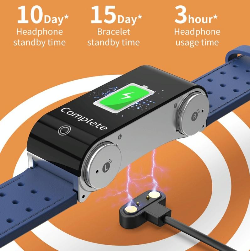 - Standby time: Headphones – 7 to 15 days, bracelet – 10 days