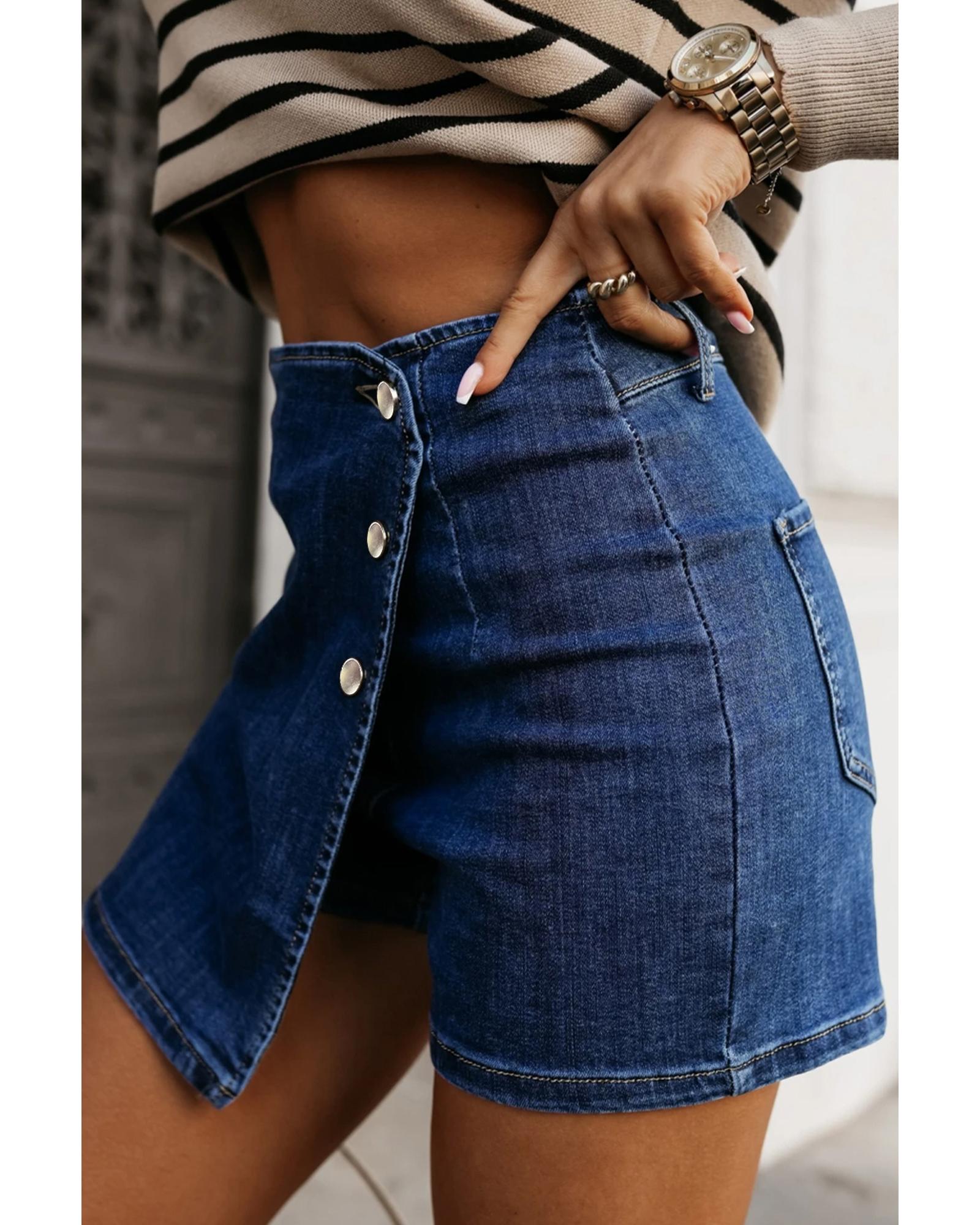This pair of high waist denim shorts features a trendy asymmetric wrapped design with button details, offering a modern and stylish look. The high-waisted cut accentuates the waistline, making it a versatile addition to any wardrobe. Crafted from durable and comfortable denim, these shorts are suitable for various casual occasions.