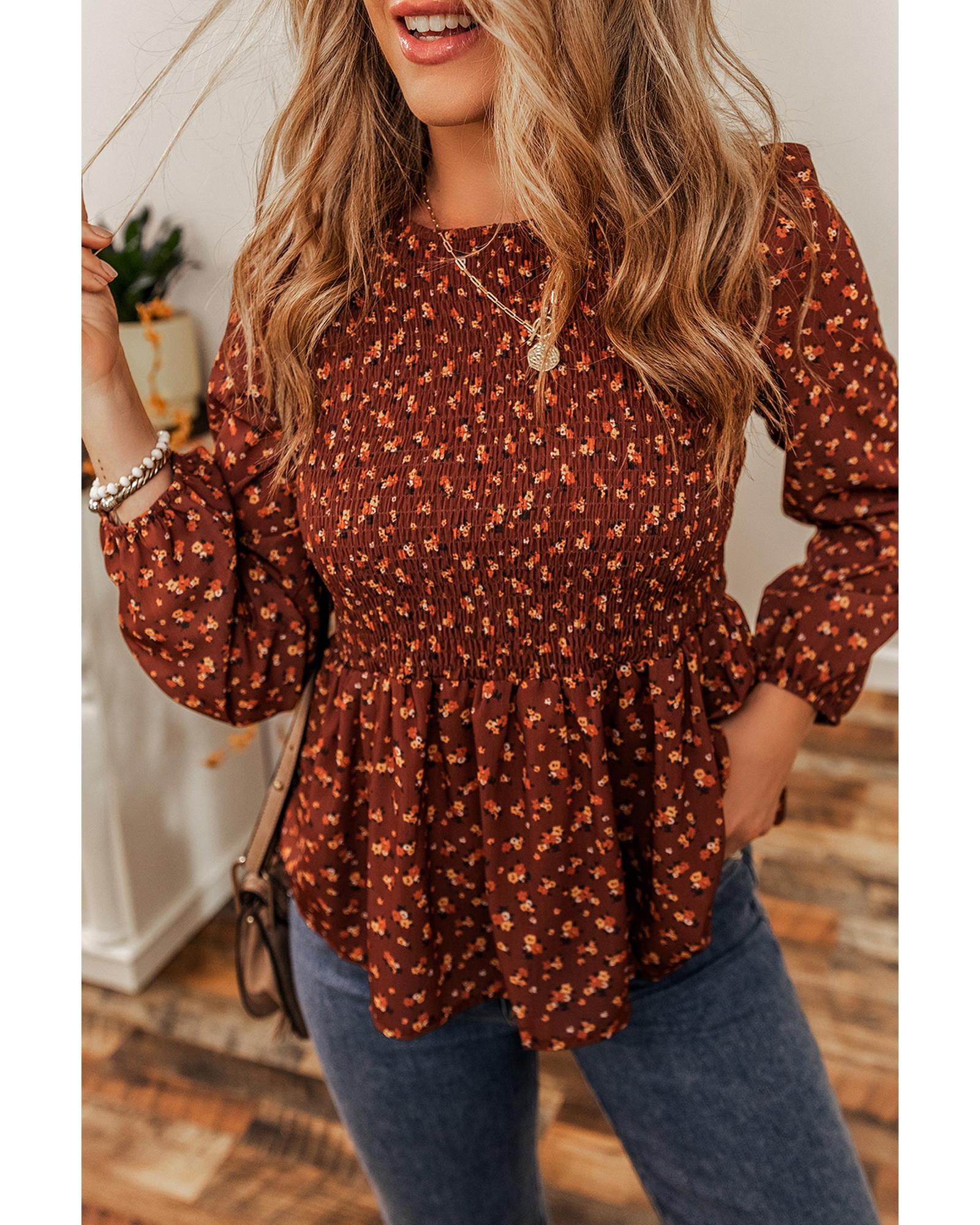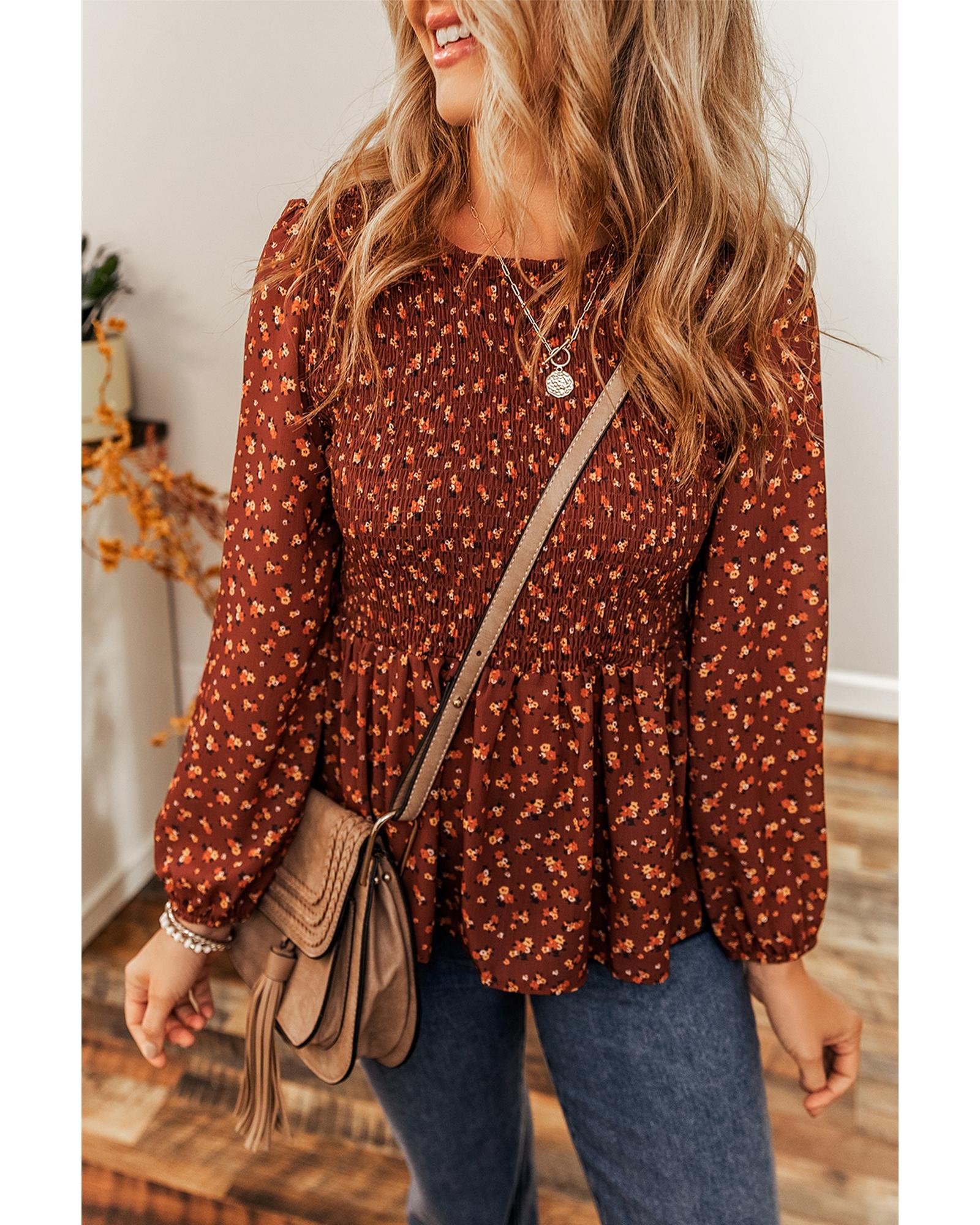 Boho Floral Smocked Bust Ruffled Peplum Blouse – S