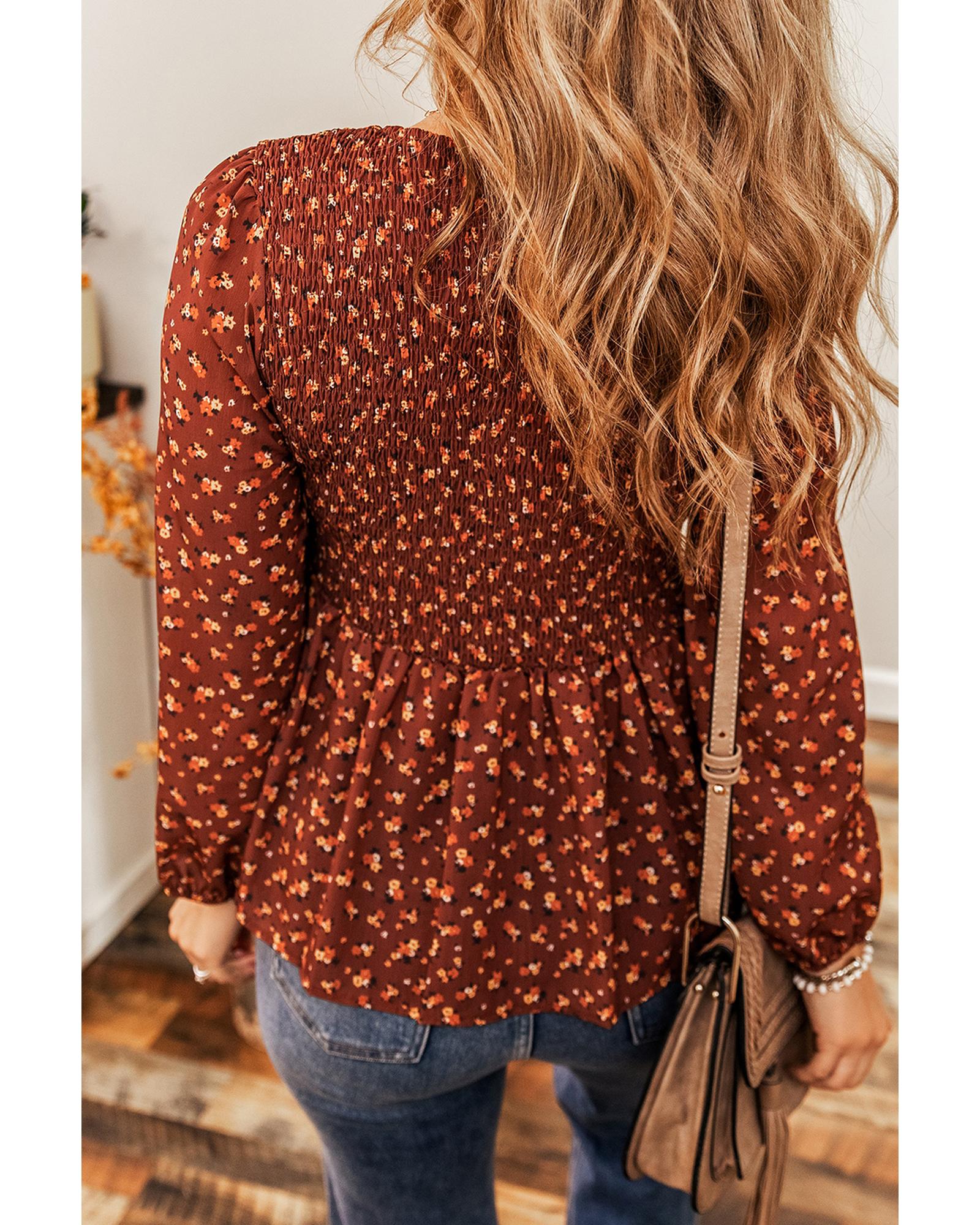 This boho floral smocked bust ruffled peplum blouse combines a trendy fitted silhouette with a feminine and bohemian style. Its charming floral pattern and elegant design make it a versatile addition to any wardrobe, suitable for various occasions.