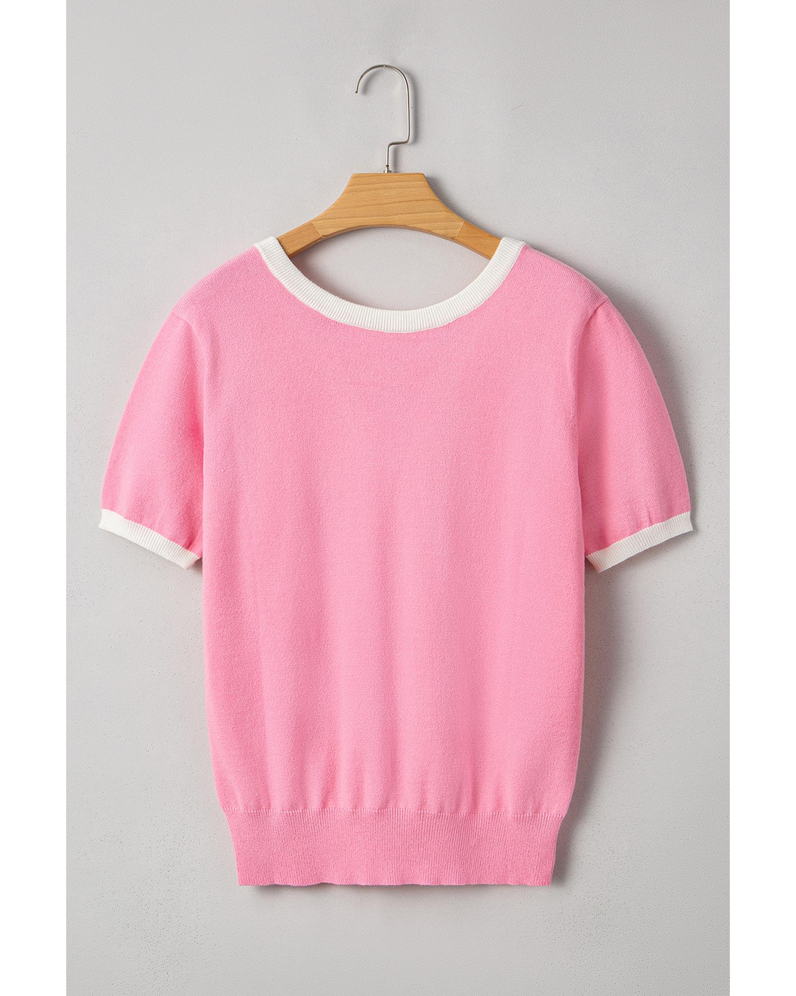 Bonbon Colorblock Bow V-Shape Cut Back Short Sleeve Sweater – XL