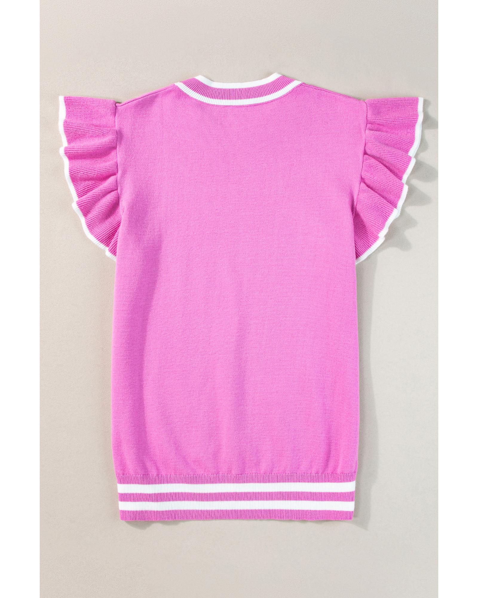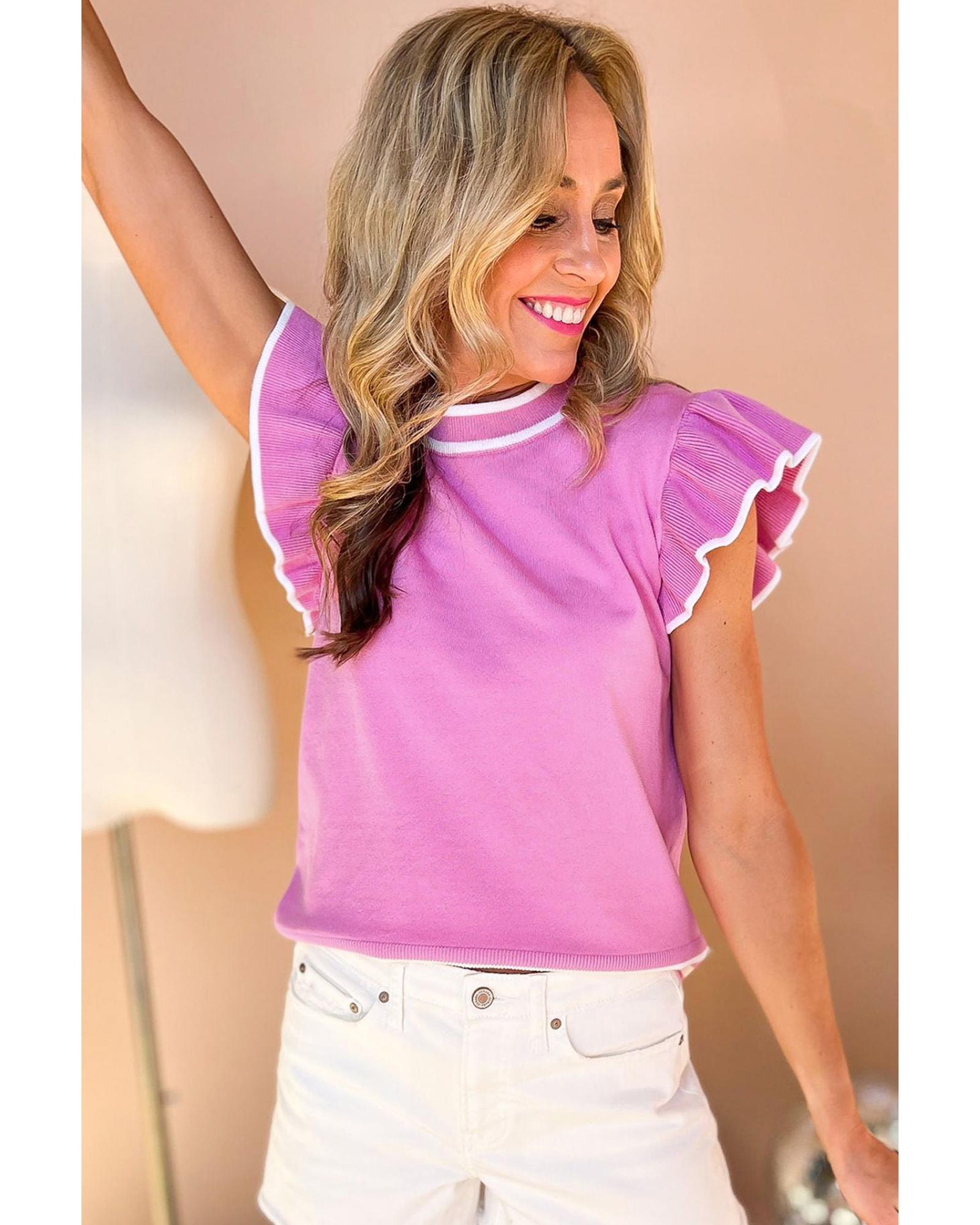 This knitted top features a trendy fitted design with a classic round neck and playful ruffled sleeves. The sleek edge piping detail adds a refined touch, making it suitable for various casual and stylish occasions. Crafted from a soft and comfortable blend of materials, it offers high elasticity for a comfortable fit.