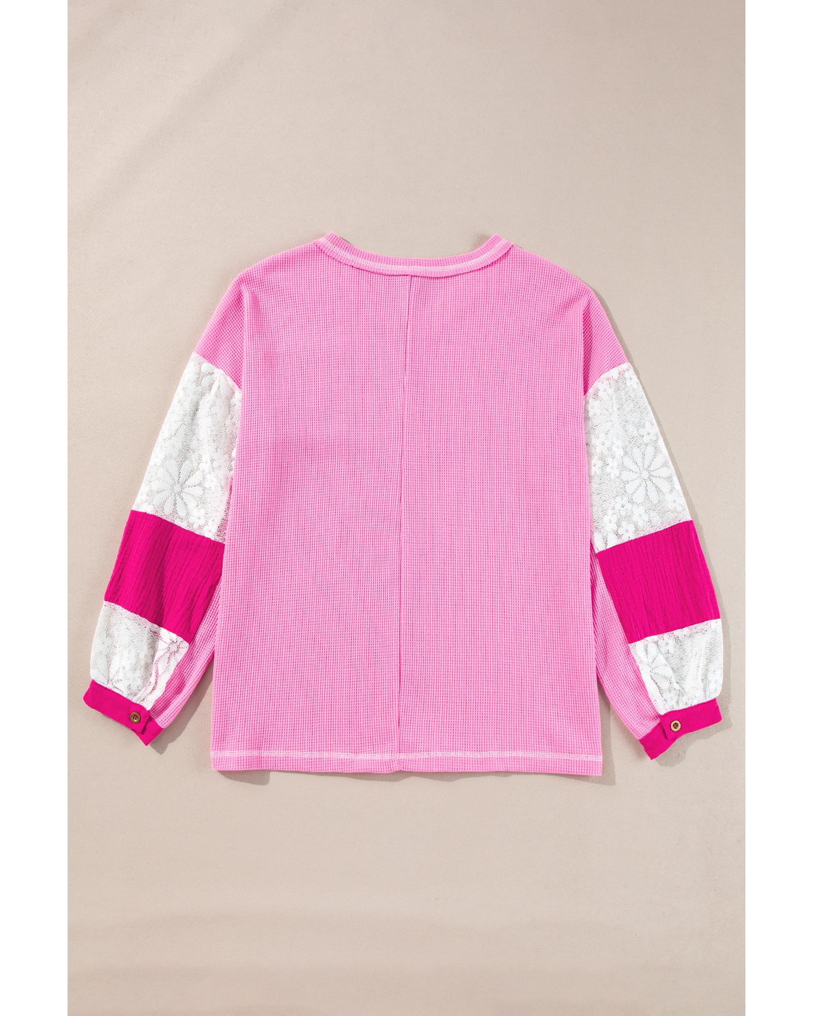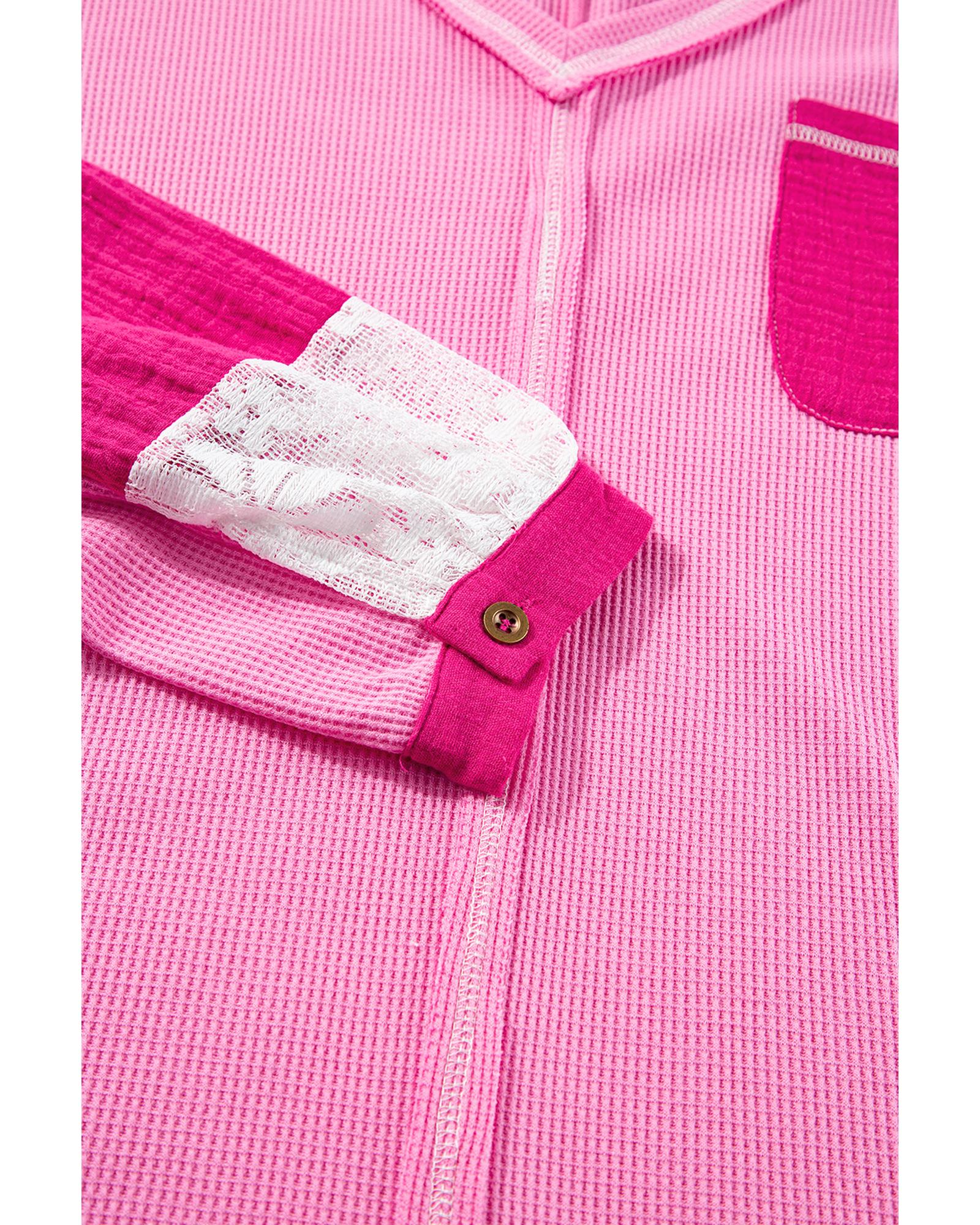 Bonbon Lace Floral Patchwork Sleeve Stitching V Neck Rib Knit Blouse – L