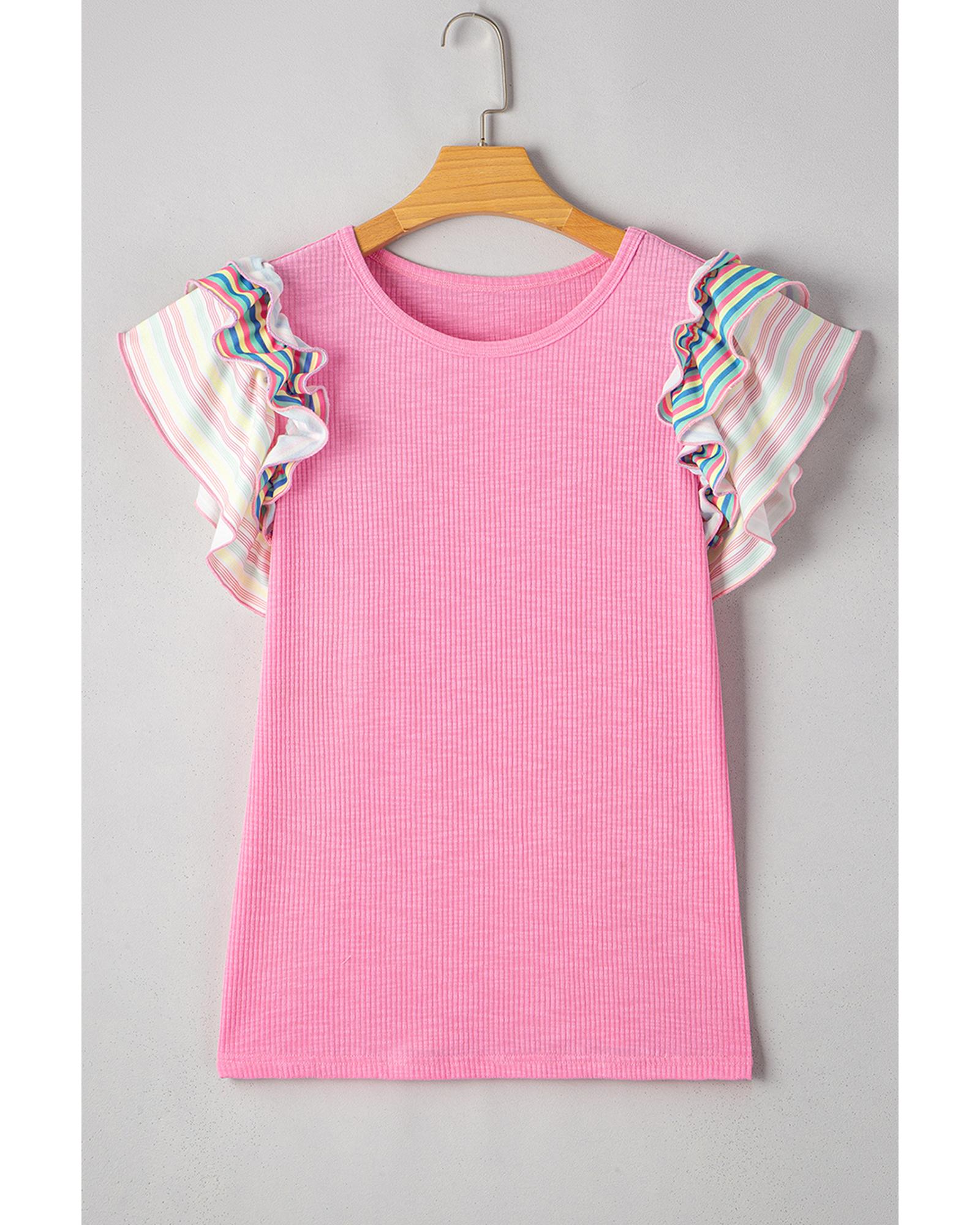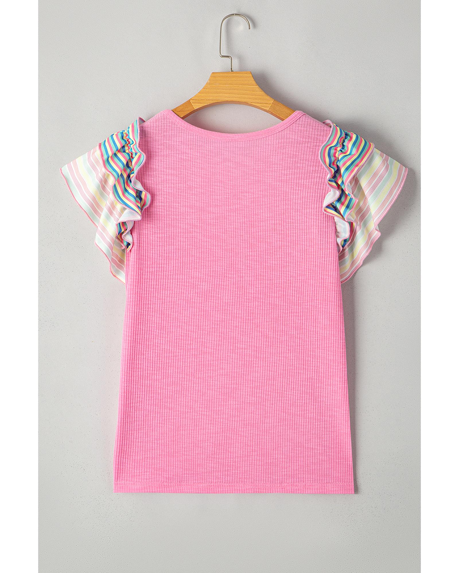 Bonbon Striped Ruffle Flutter Sleeve Ribbed Blouse – L