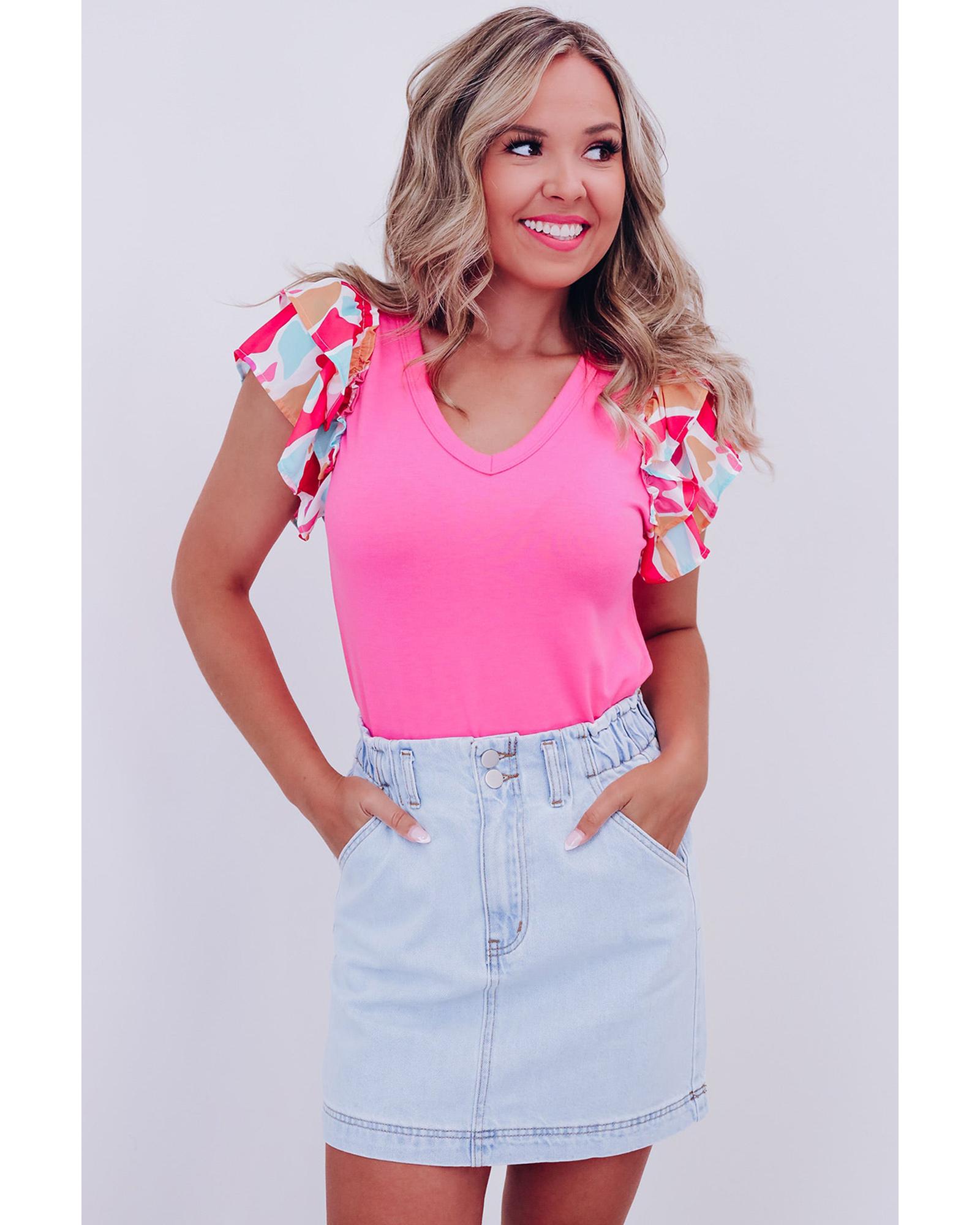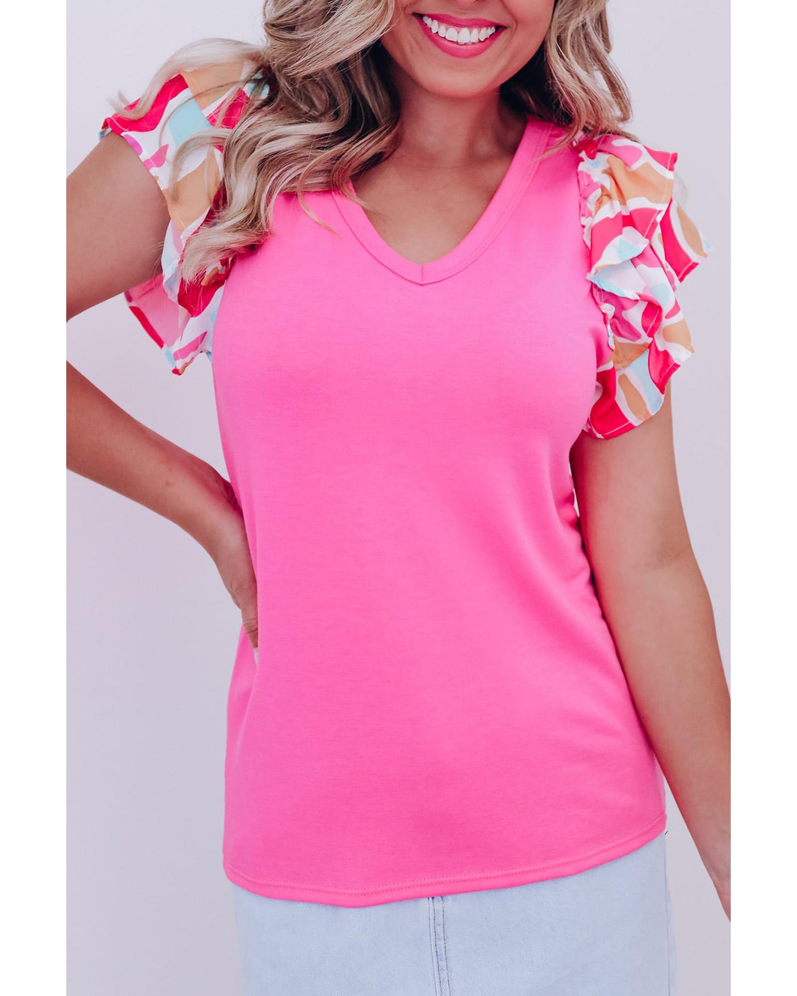 This printed ruffle sleeve T-shirt features a trendy fitted design with a stylish V-neckline and eye-catching abstract pattern on the sleeves. The versatile style can be dressed up or down, making it suitable for various occasions. Its high elasticity provides a comfortable fit for different body types, and the neutral sizing makes it a great choice for anyone.