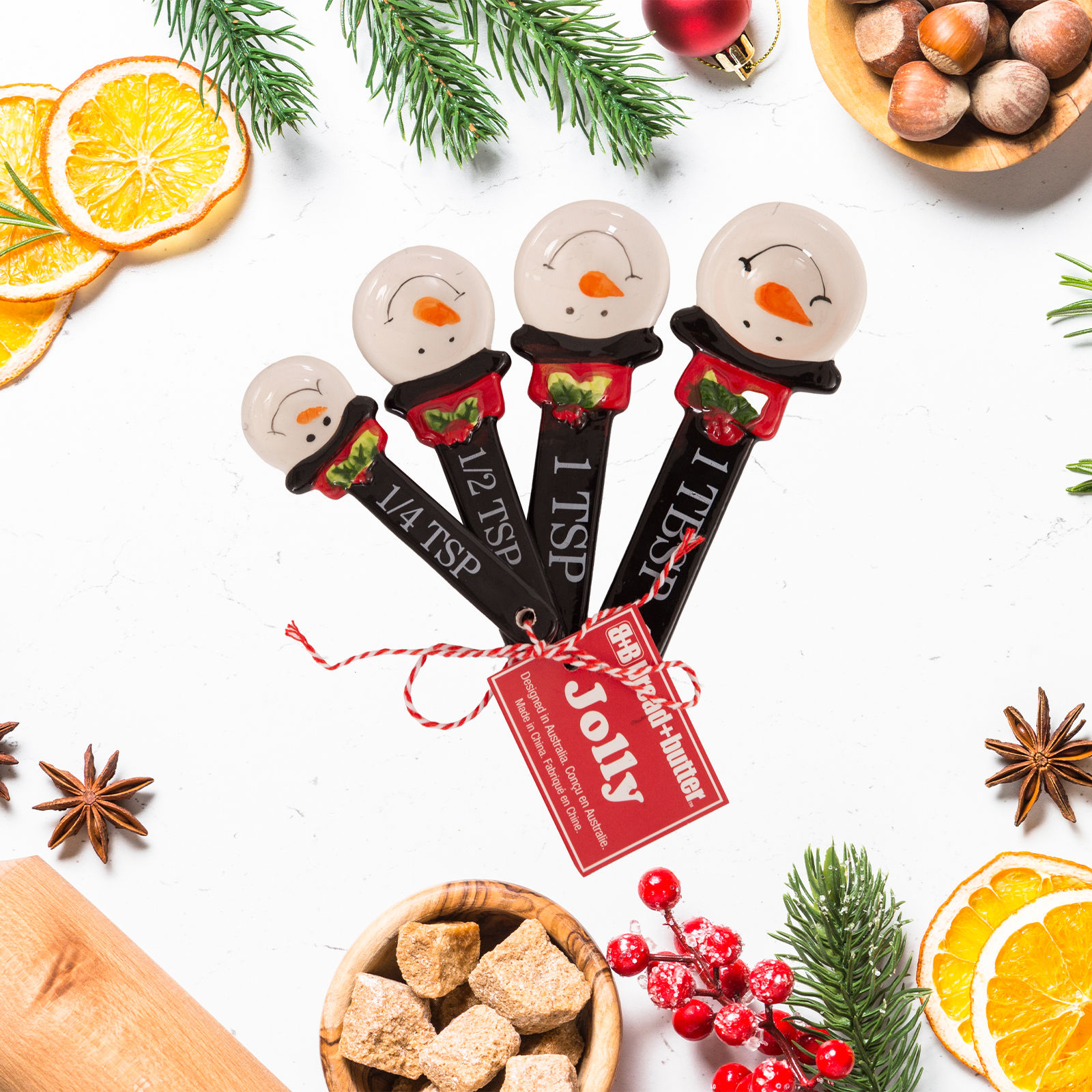 This set of four measuring spoons features charming snowman figurines, perfect for adding a festive touch to your baking. Designed for both functionality and style, these spoons help you measure ingredients accurately while enhancing your kitchen decor during the holiday season.