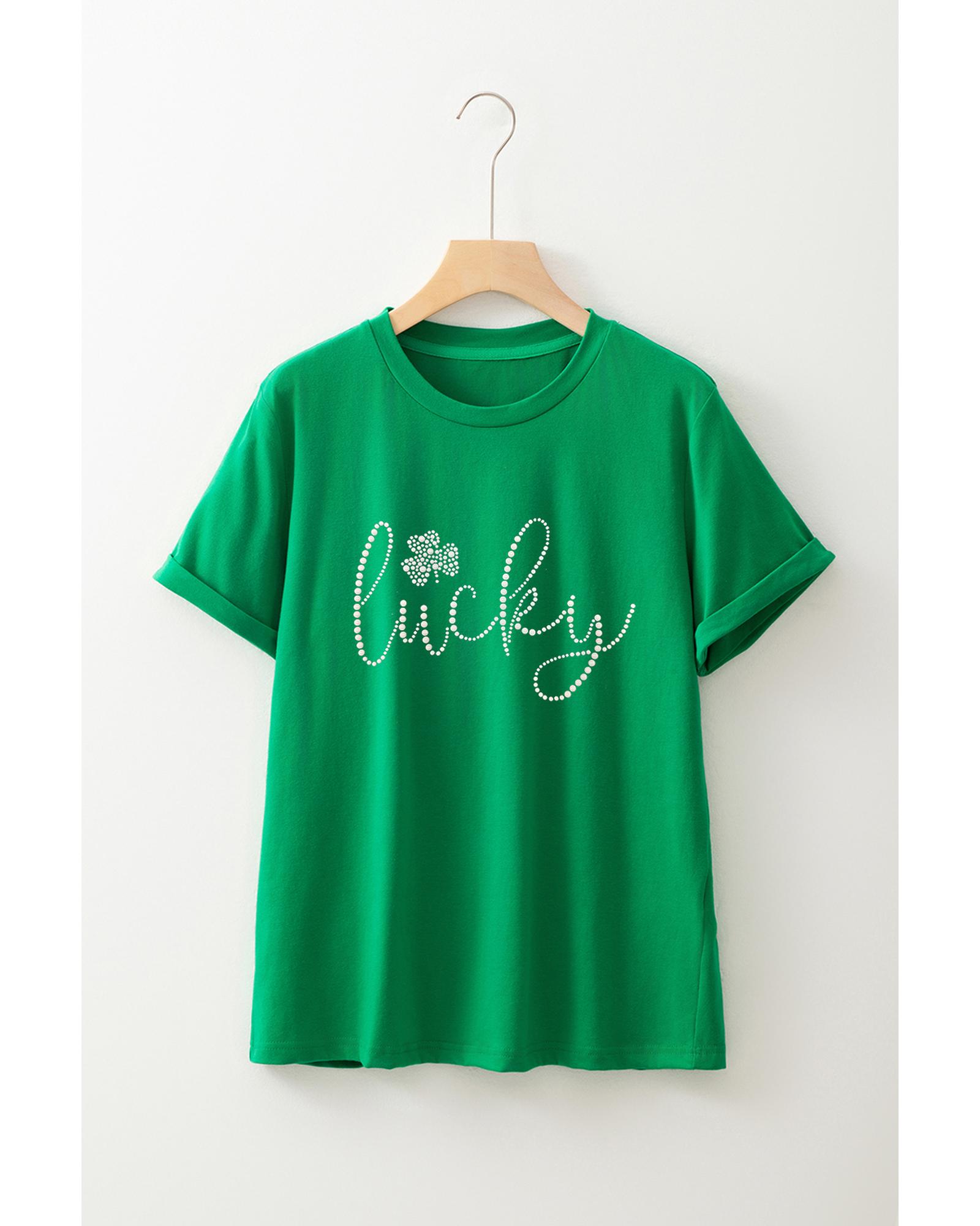 This bright green graphic tee features a lucky clover design embellished with ceramic rhinestones, making it a stylish and eye-catching addition to your casual wardrobe. The crew neck and short sleeves provide a comfortable and versatile fit suitable for various occasions.