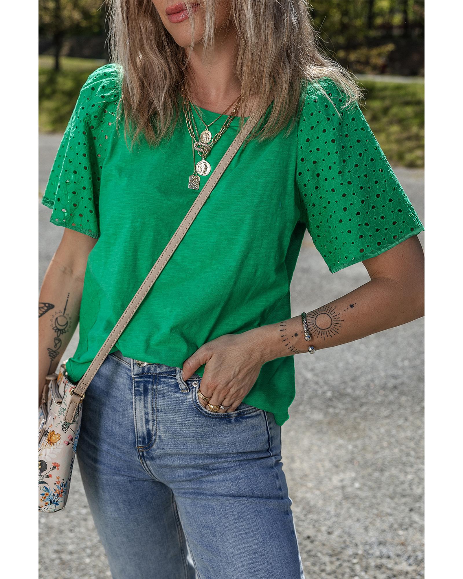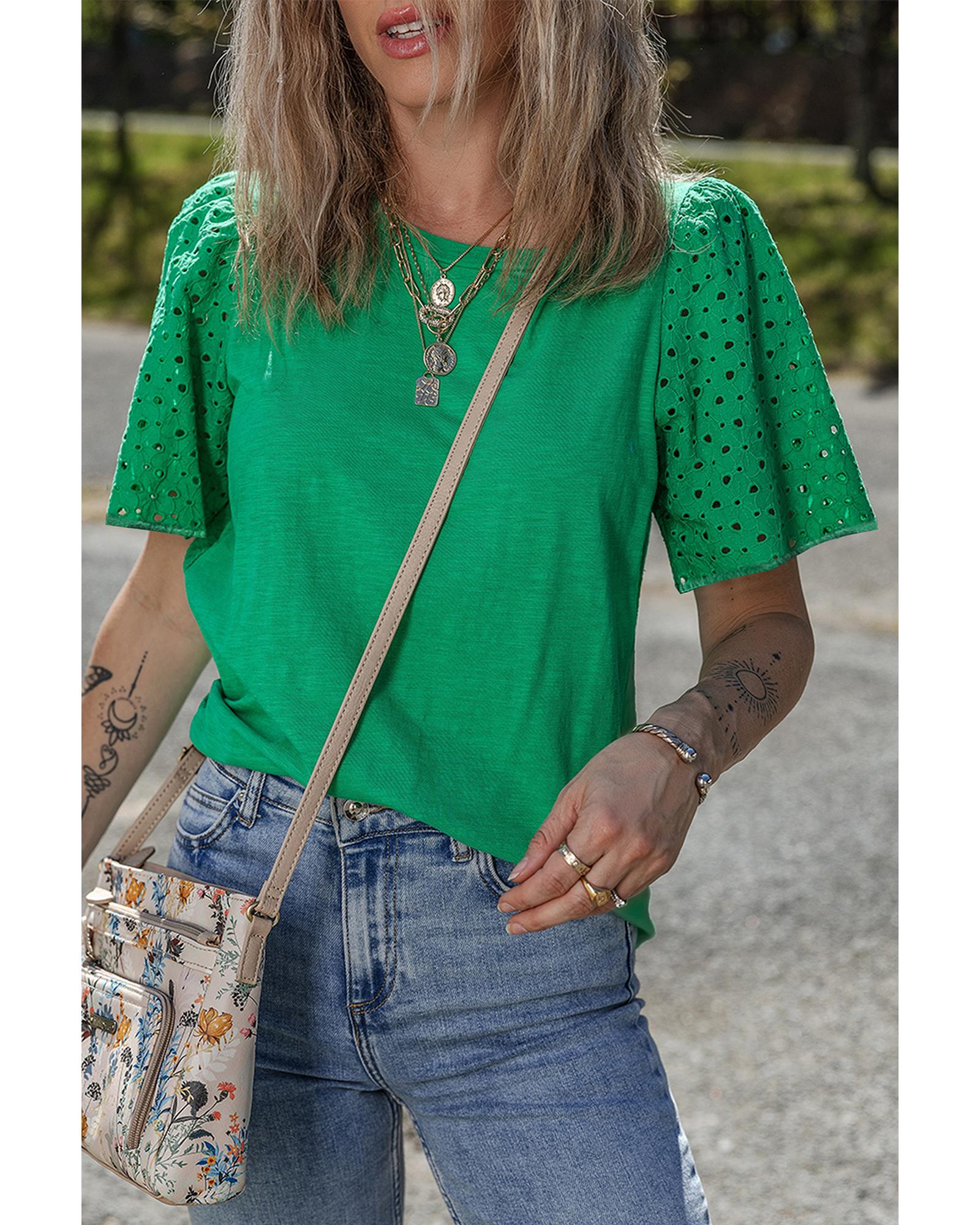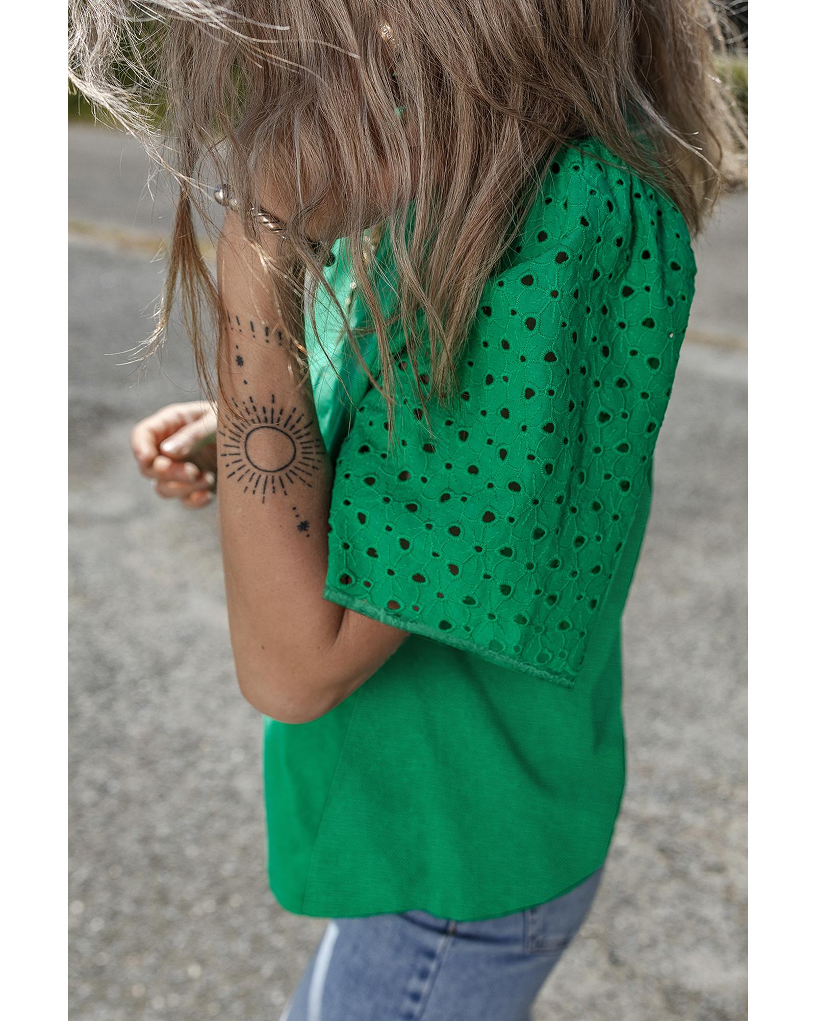 This bright green eyelet embroidered patchwork shift top combines delicate detailing with a stylish design. Its versatile silhouette makes it suitable for both casual and dressy occasions, offering a comfortable and flattering fit.