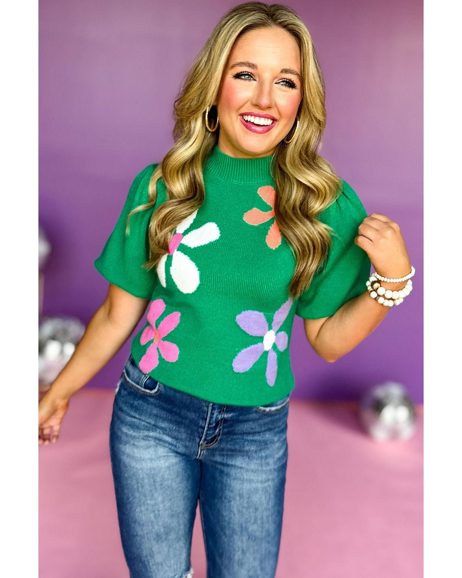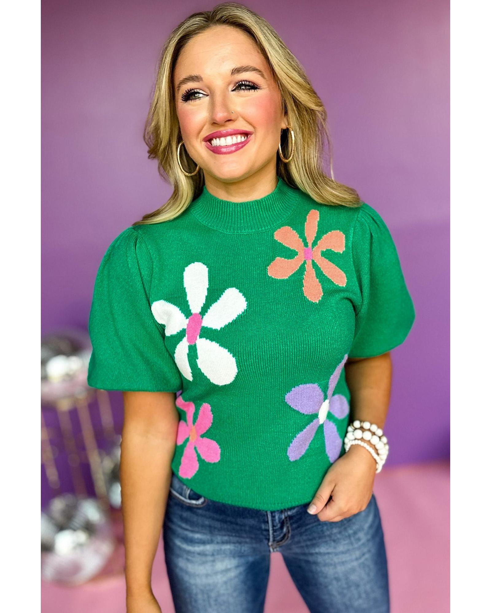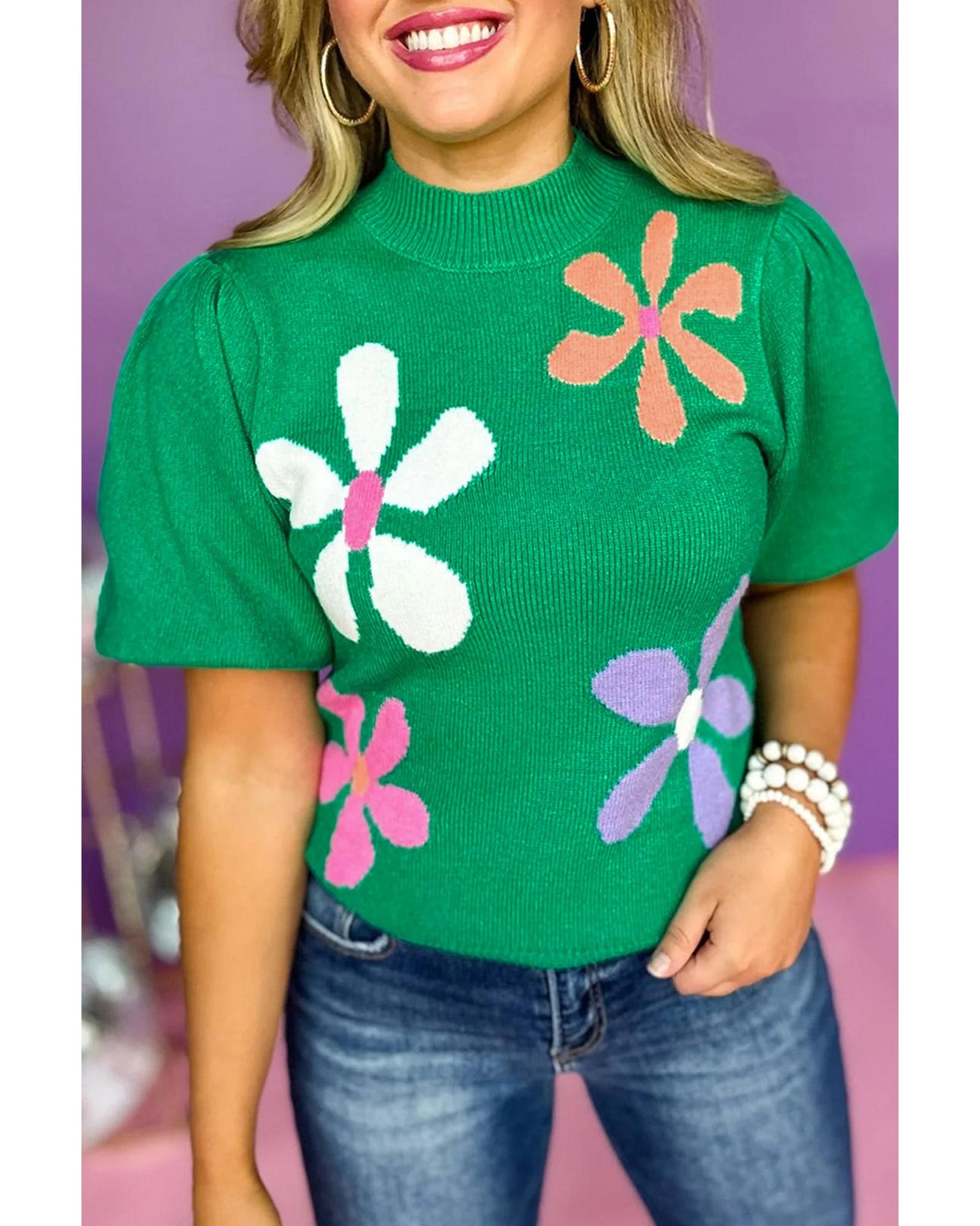 This bright green floral bubble short sleeve sweater features a playful floral pattern and a unique bubble sleeve design, offering a stylish and graceful look. Made from lightweight, breathable fabric, it is versatile and easy to pair with jeans or a skirt for various occasions.