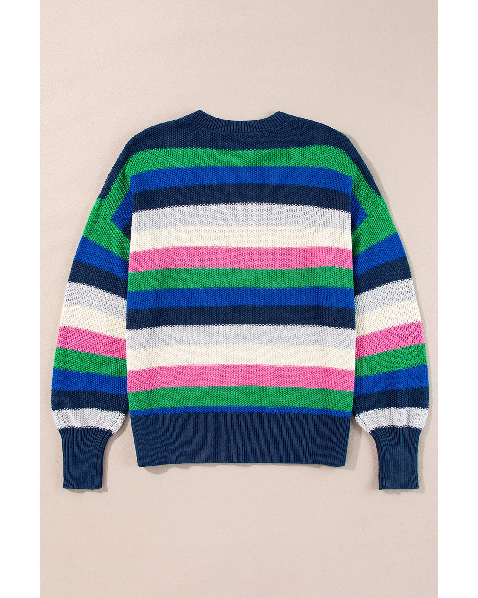 This bright green rainbow striped crew neck sweater features a trendy and relaxed design, perfect for adding a fun and eye-catching element to your wardrobe. The drop shoulder style offers a modern fit, while the knitted construction provides warmth and comfort. Available in multiple sizes, it combines style and practicality for everyday wear.