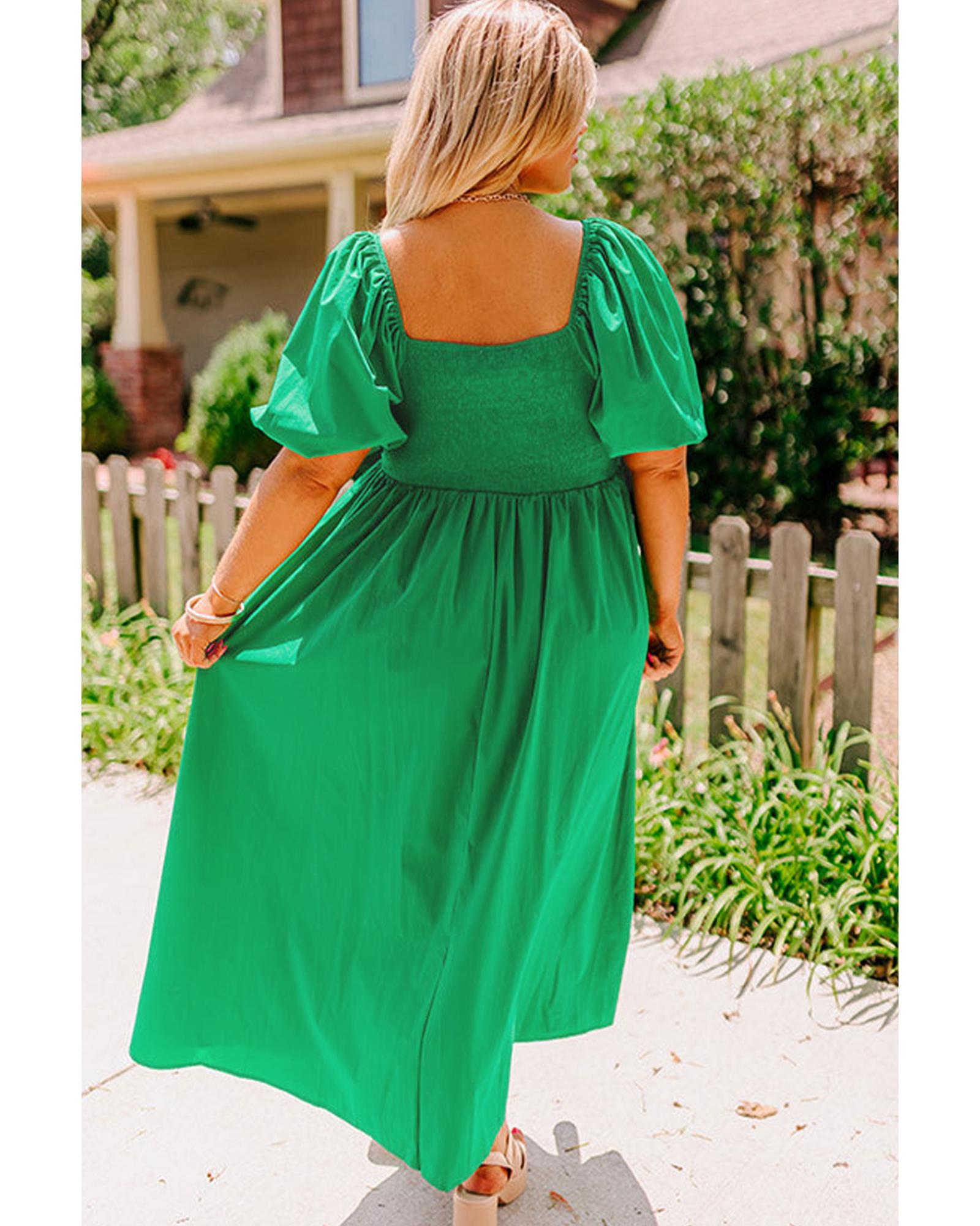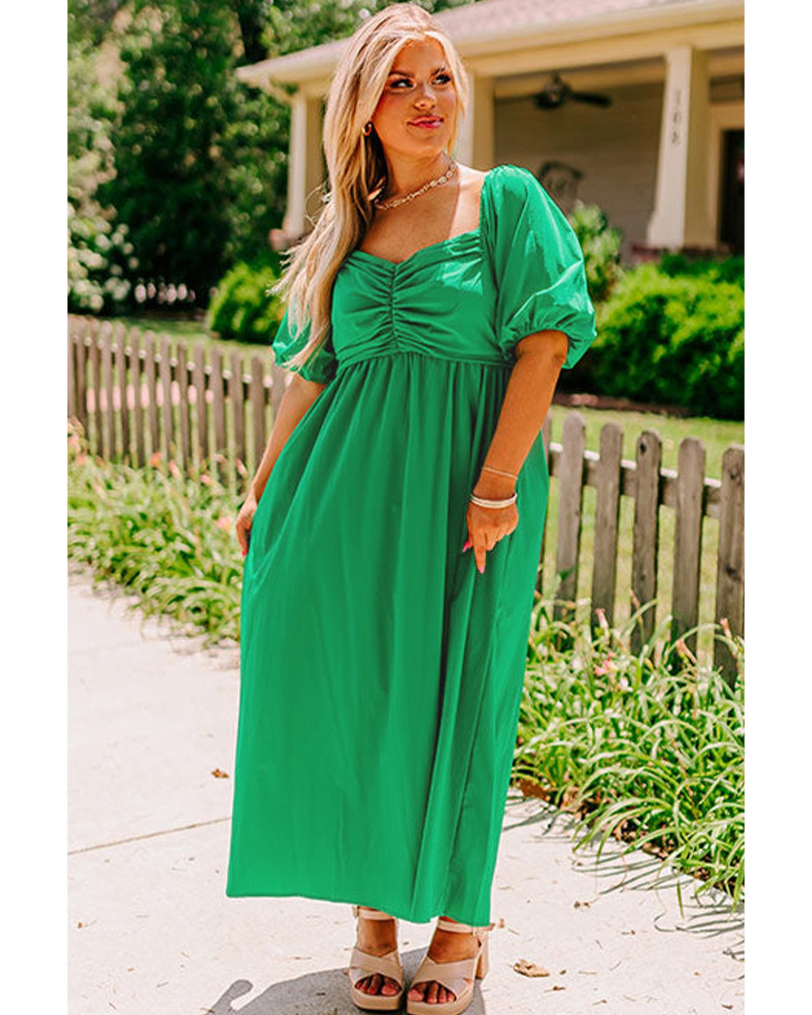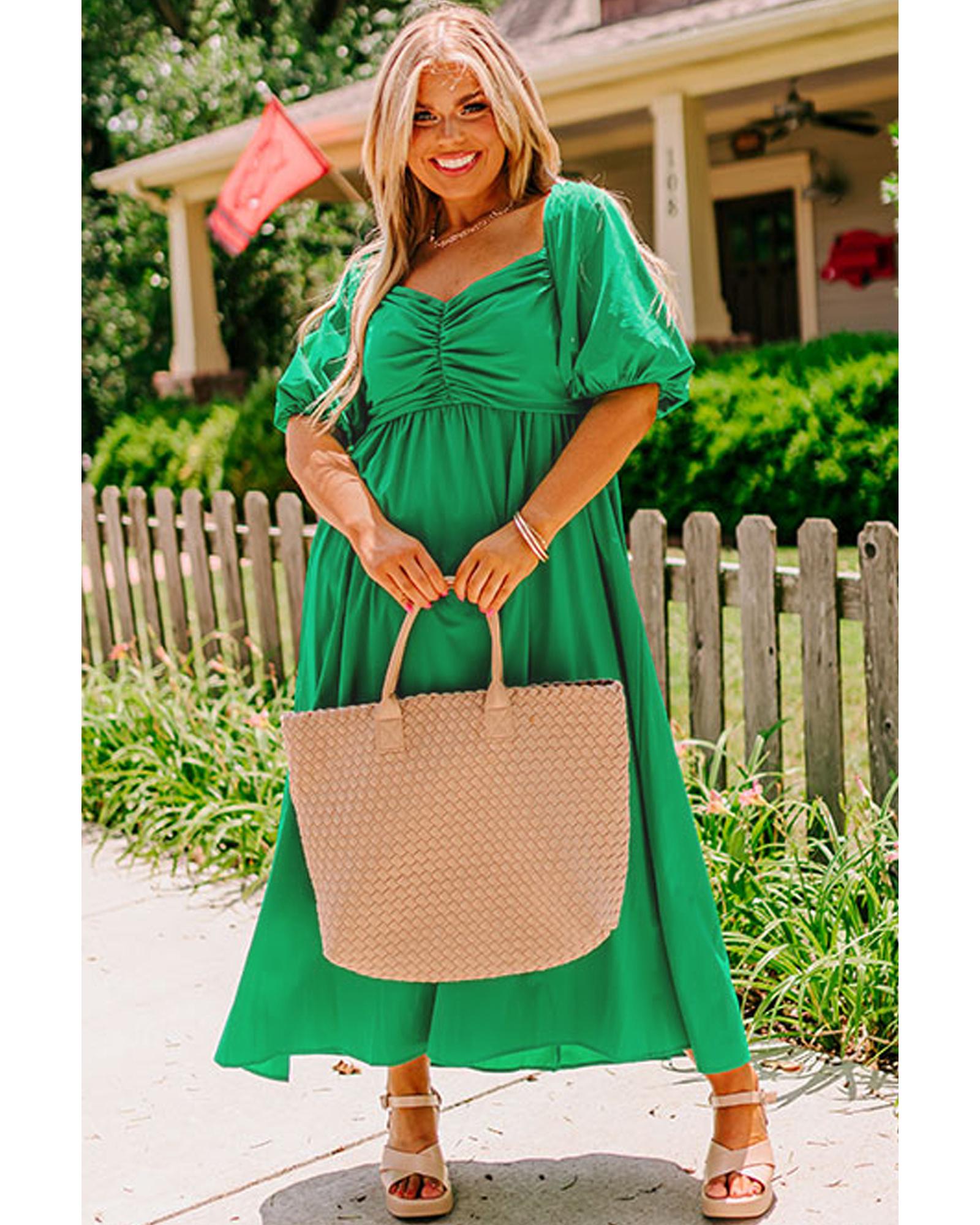 Bright Green Ruched Front Puff Sleeve Plus Size Long Dress – 2X