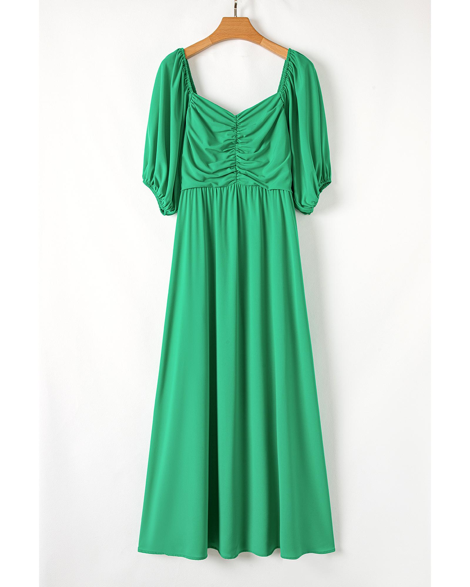 This bright green plus size long dress features a stylish ruched front design and trendy puff sleeves, making it suitable for a variety of occasions including parties and formal events. The dress offers a comfortable fit and a fashionable appearance for plus size women.