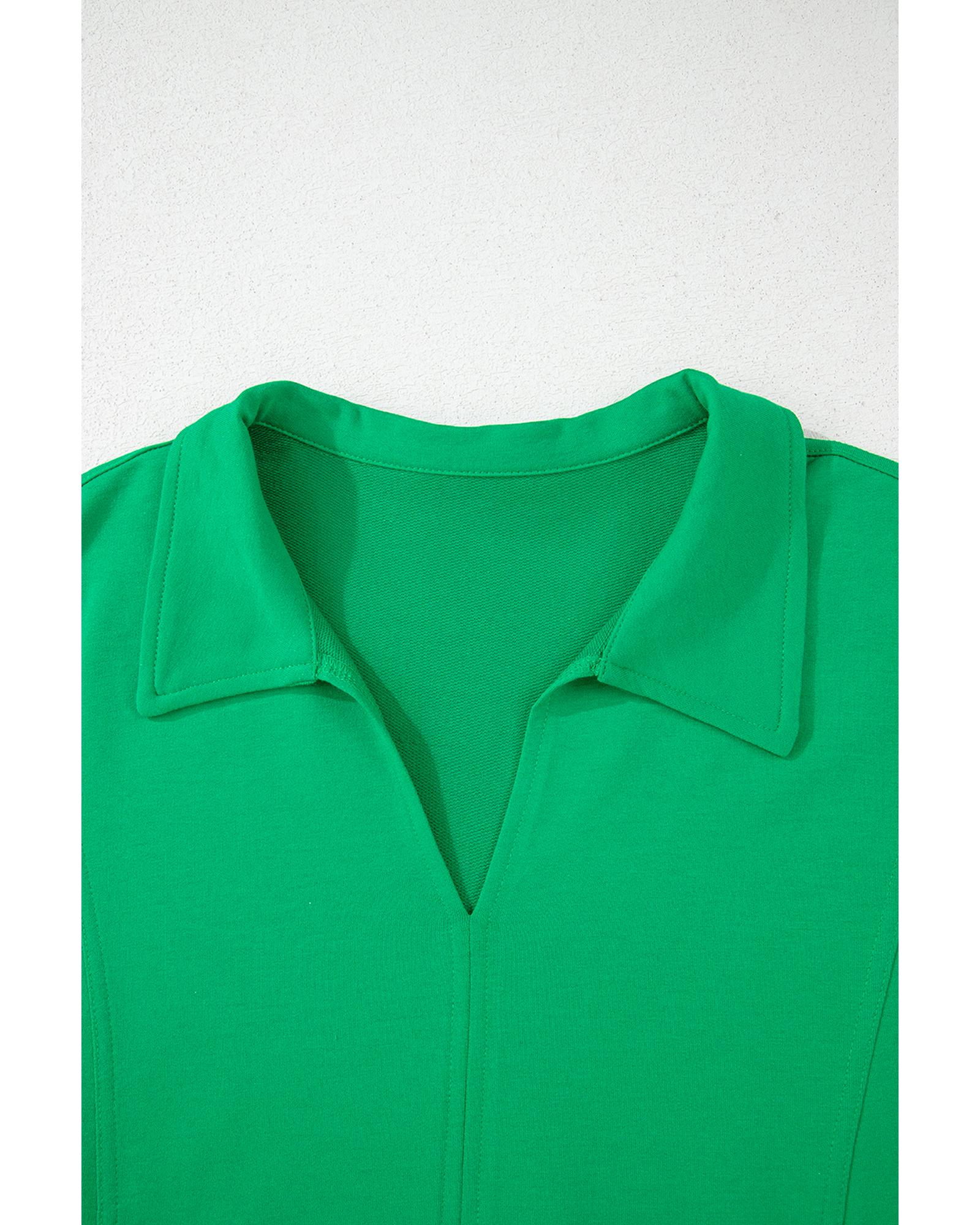 This bright green short sleeve blouse features a turn-down collar with a slight V-neckline, designed to provide a stylish and comfortable fit for full-figured women. Made from soft and lightweight fabric, it is suitable for casual or semi-formal occasions, offering a relaxed yet fashionable look.