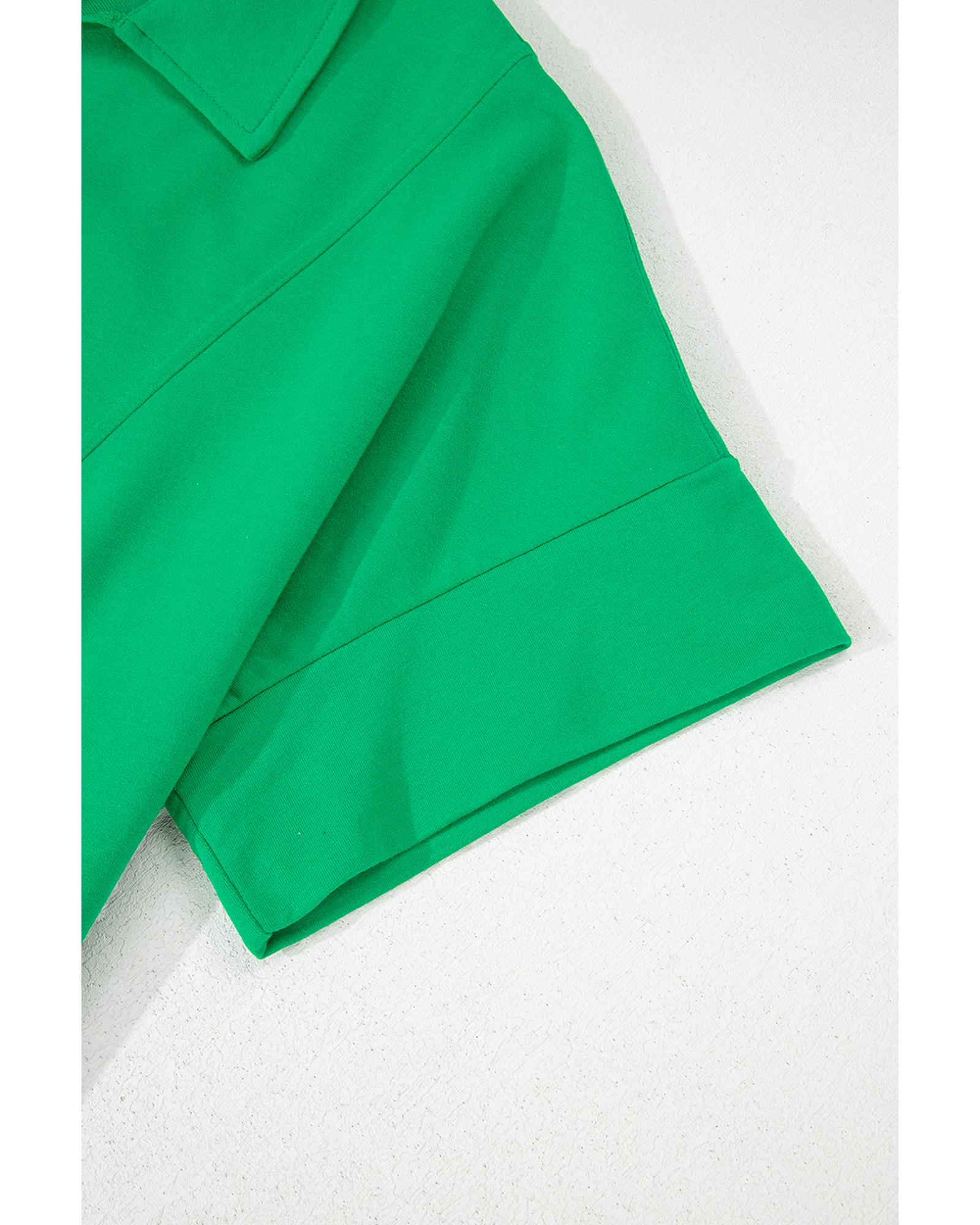 This bright green short sleeve blouse features a turn-down collar with a slight V-neckline, designed for a trendy and comfortable fit. It is suitable for casual or semi-formal occasions and offers a relaxed yet stylish appearance.