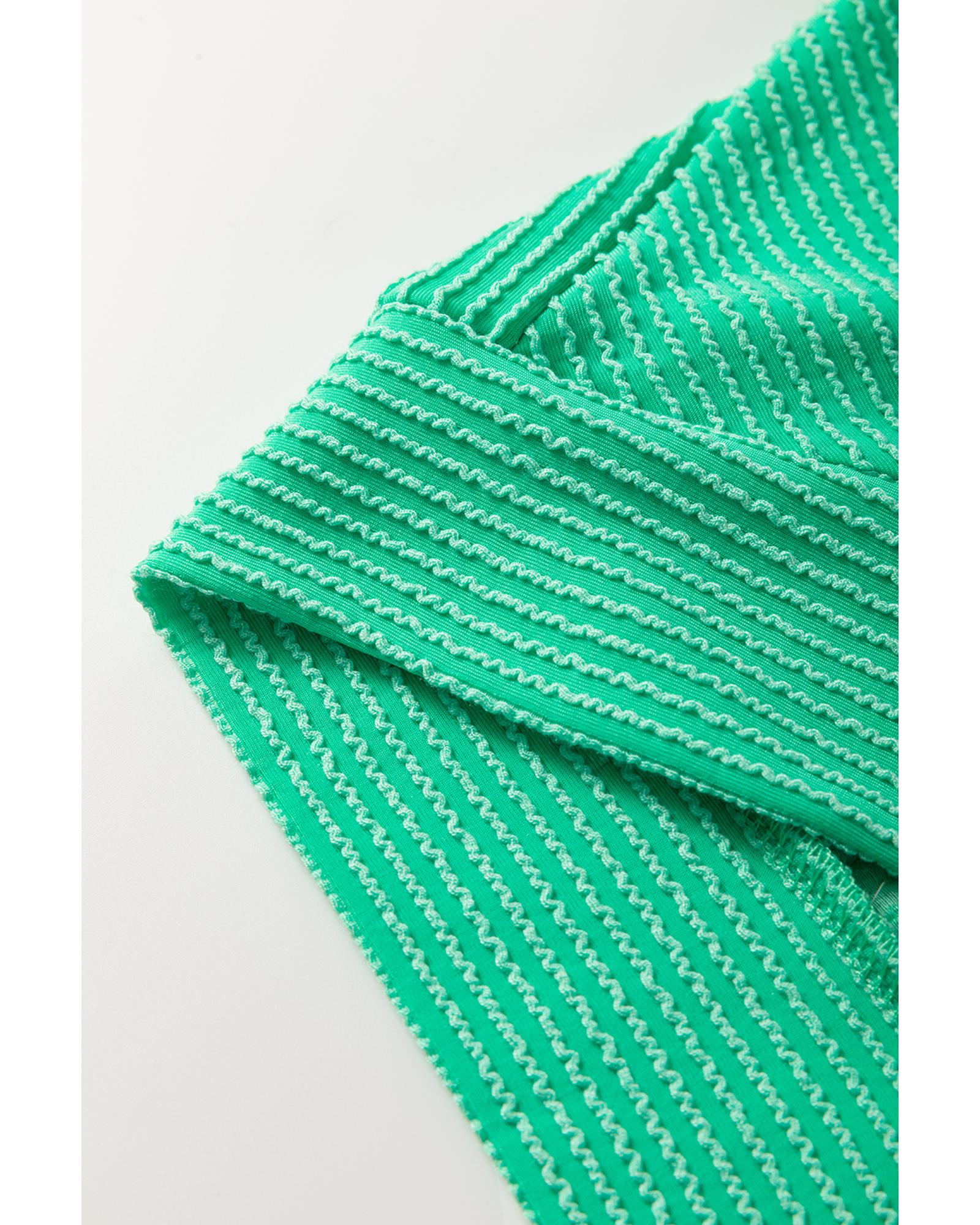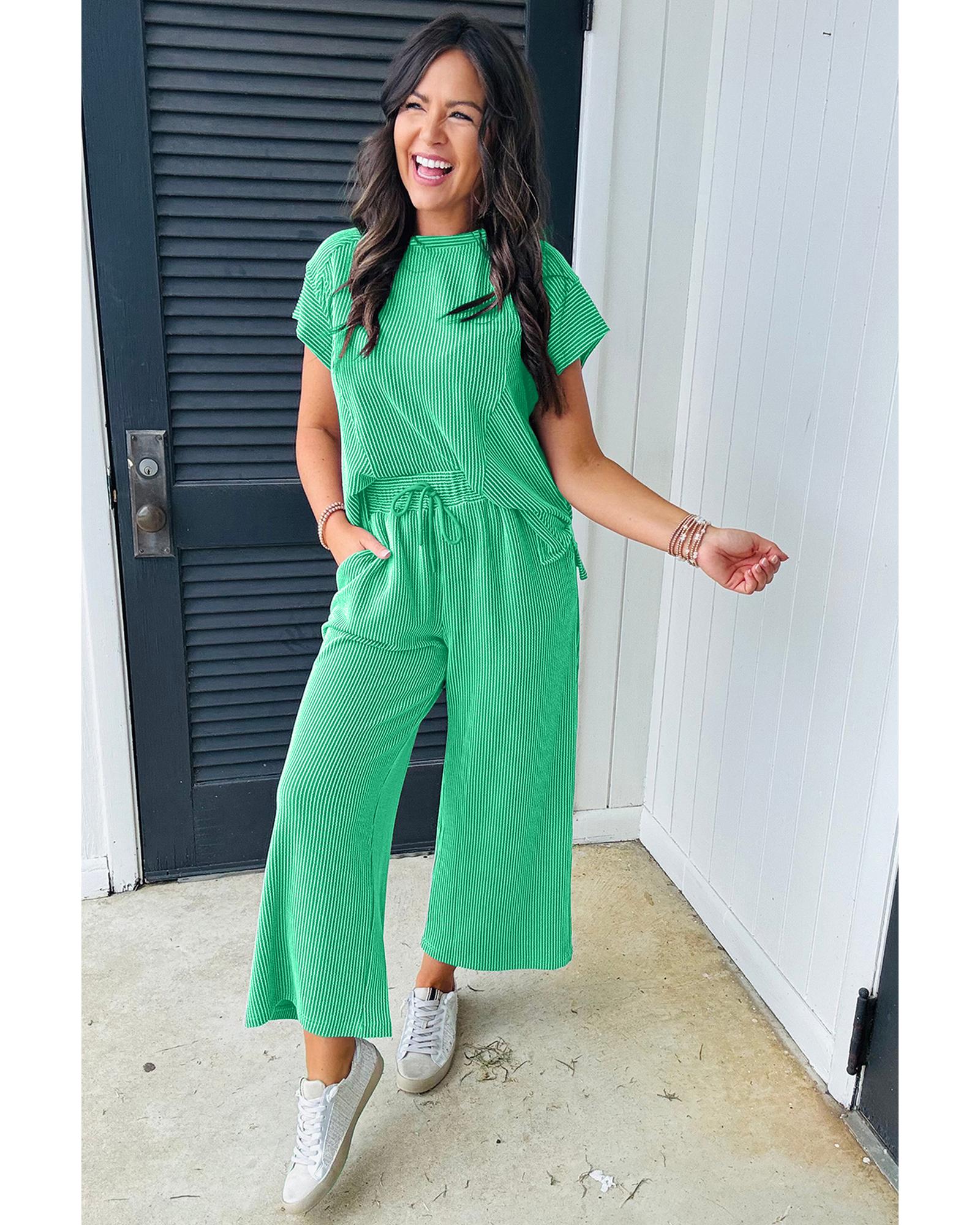 This bright green solid corded knit short sleeve T-shirt and wide leg pants set offers a trendy and comfortable look suitable for casual wear. The set features a versatile color and textured fabric, making it easy to style for various occasions.